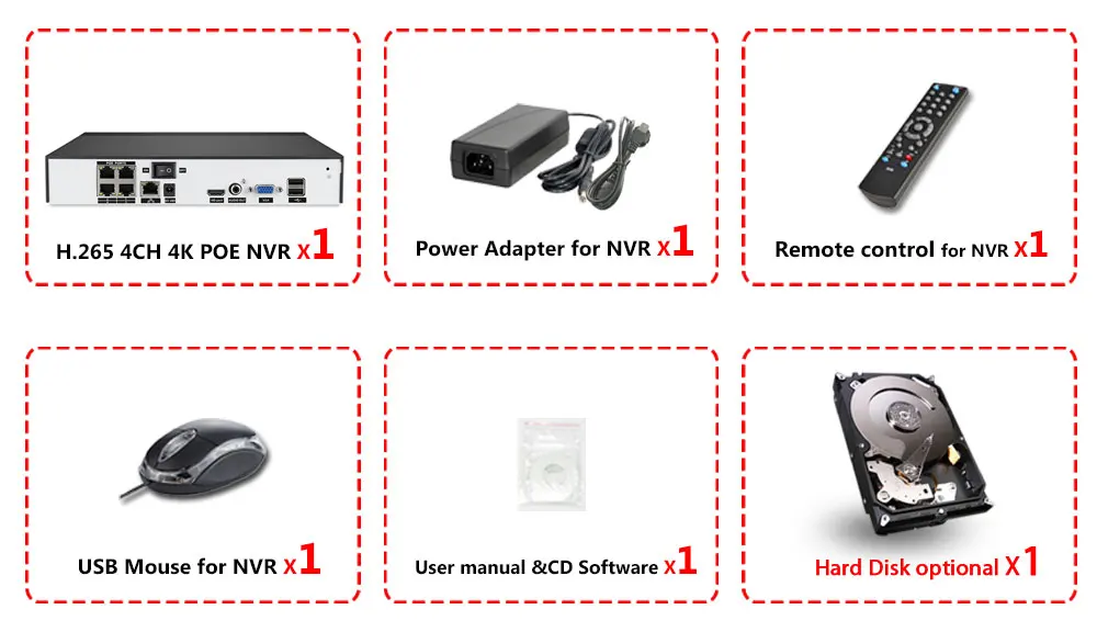 1 сетевой видеорегистратор 4CH 4K POE NVR 1 источник питания для NVR 1 usb-мышь для NVR 1 компакт-диск для программного обеспечения NVR 1 пульт дистанционного управления для жесткого диска NVR опционально! ! R