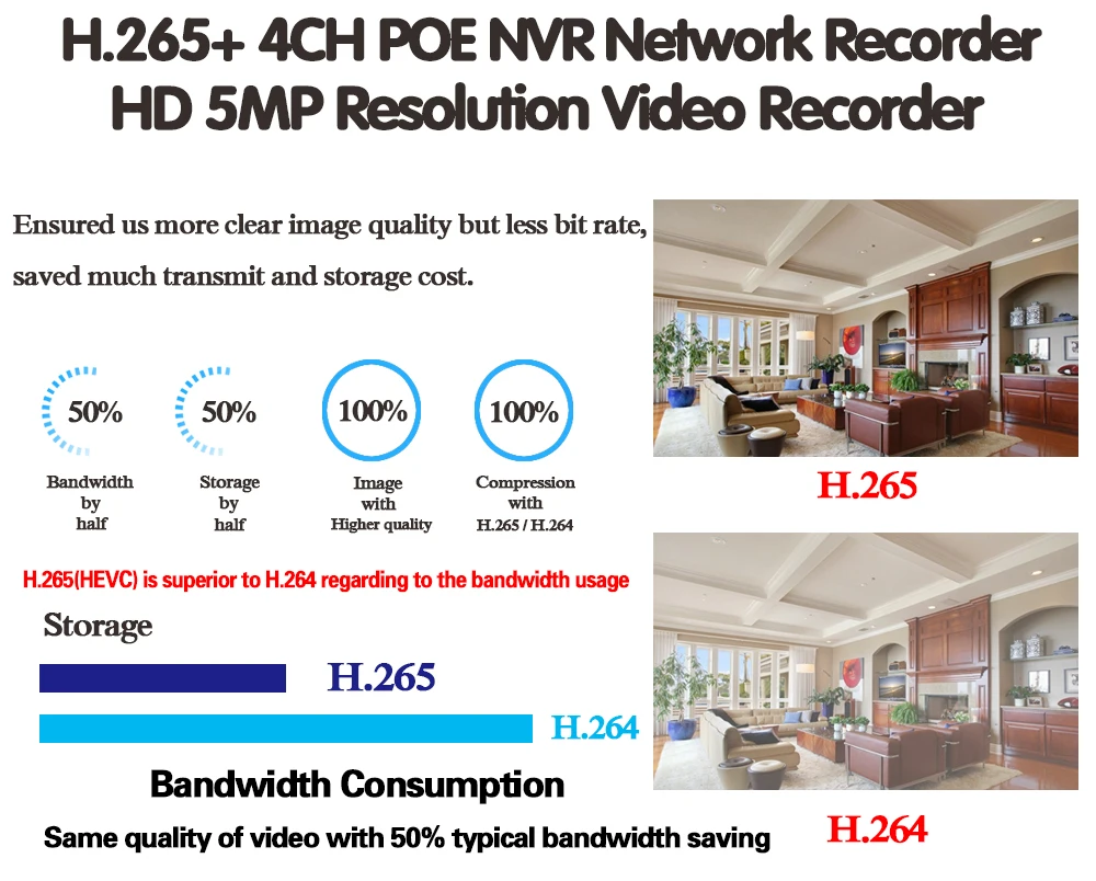 H.265More Clear , HD разрешение offeryou лучшее качество изображения более низкая скорость. Экономит больше места для хранения, может уменьшить 40%-50% размер файла, сохранить место для хранения HDD и снизить стоимость покупки.