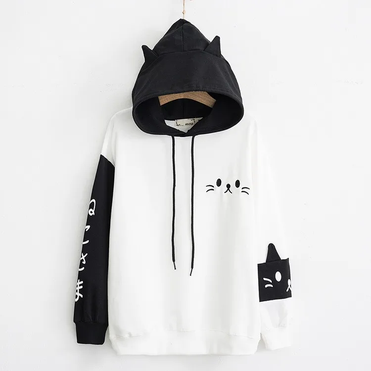 Милый Женский свитшот в стиле Харадзюку, черная, розовая винтажная Толстовка с длинным рукавом, 2021, Забавный пуловер с рисунком кошачьих ушей для девочек-подростков