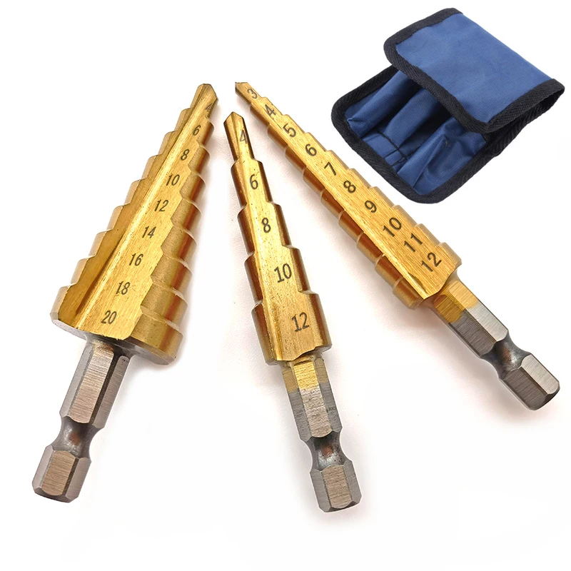 3 шт. 3-12 мм4-12 мм4-20 мм HSS ступенчатое сверло с прямым желобом с титановым покрытием для дерева и металла резак для отверстий сердечник конусный набор инструментов для сверления