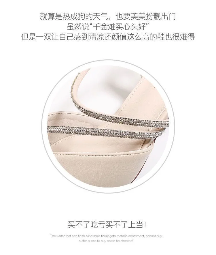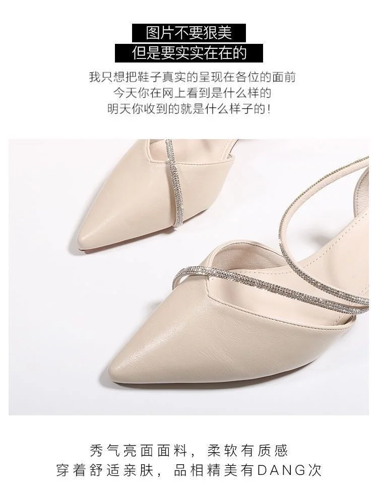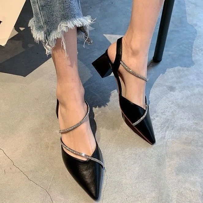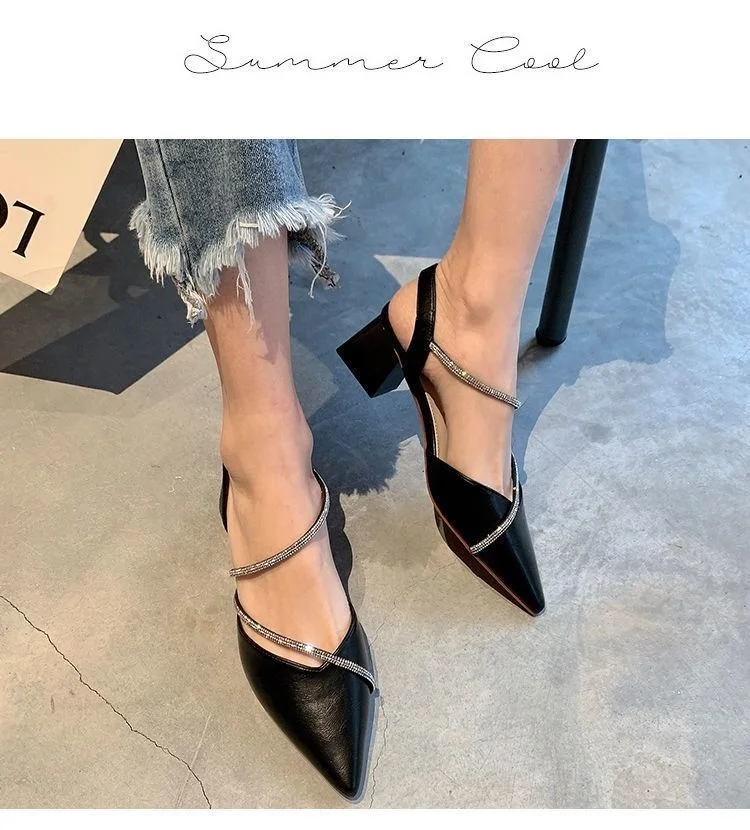 Женские босоножки; Сезон лето; Новинка 2021 года; Тонкие туфли с острым носком на среднем каблуке; Женская обувь с одной пуговицей и стразами; Женская обувь на высоком толстом каблуке