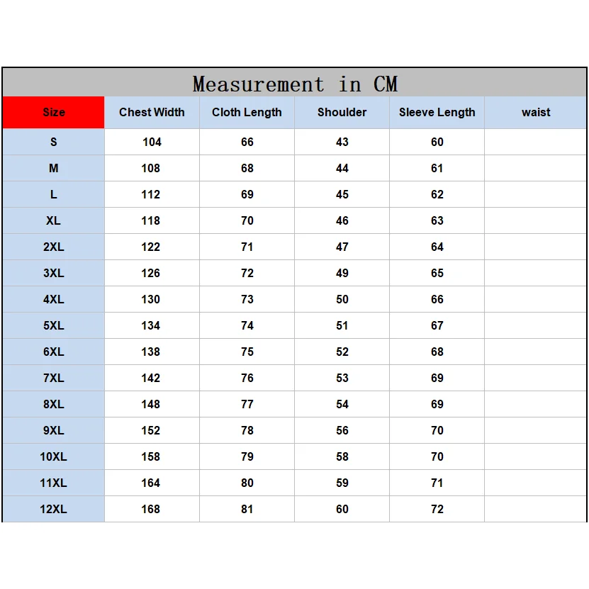 SizeS M L XL XXL XXXL4XL 5XL 6XL 7XL 8XL 9XL 10XL 11XL 12XL