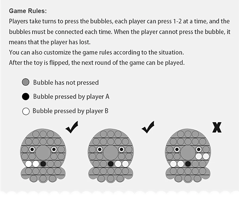 Игроки по очереди нажимают пузыри. Каждый игрок может нажимать 1-3 пузырька за раз, и каждый раз необходимо нажимать на подключенные пузырьки. Если игрок не может нажать пузырь, это означает, что игрок потерял.Вы также можете настроить правила игры в соответствии с ситуацией.После того, как игрушка будет перевернута, можно будет играть в следующий раунд игры.