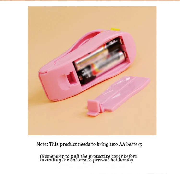 Для первого использования упаковочной машины, вам нужно купить 2 щелочные батарейки АА. При установке, пожалуйста, обратите внимание на положительные и отрицательные электроды батареи. Нажмите и нагрейте в течение примерно 5 секунд перед уплотнением. Не используйте больше одной минуты каждый раз, чтобы предотвратить перегрев батареи.