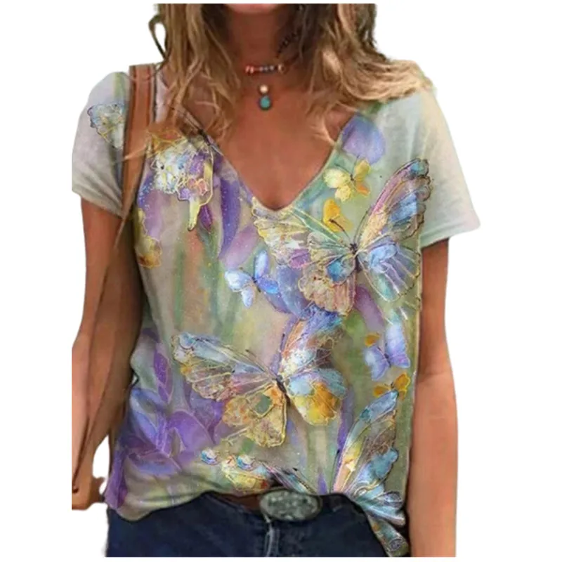 Женская футболка с коротким рукавом, V-образным вырезом и принтом