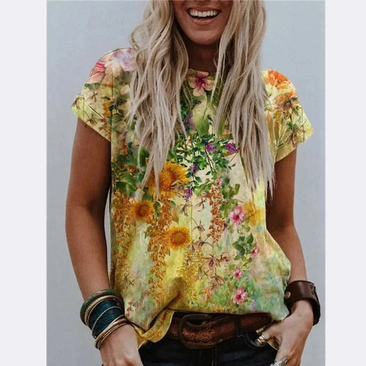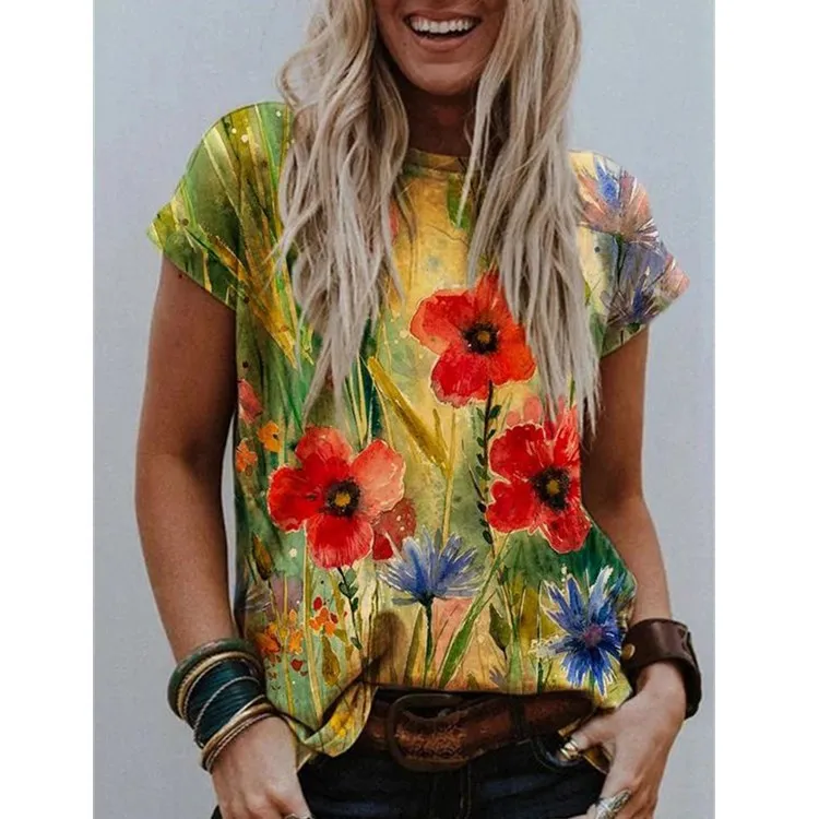 Женская футболка с коротким рукавом, круглым вырезом и цветочным принтом