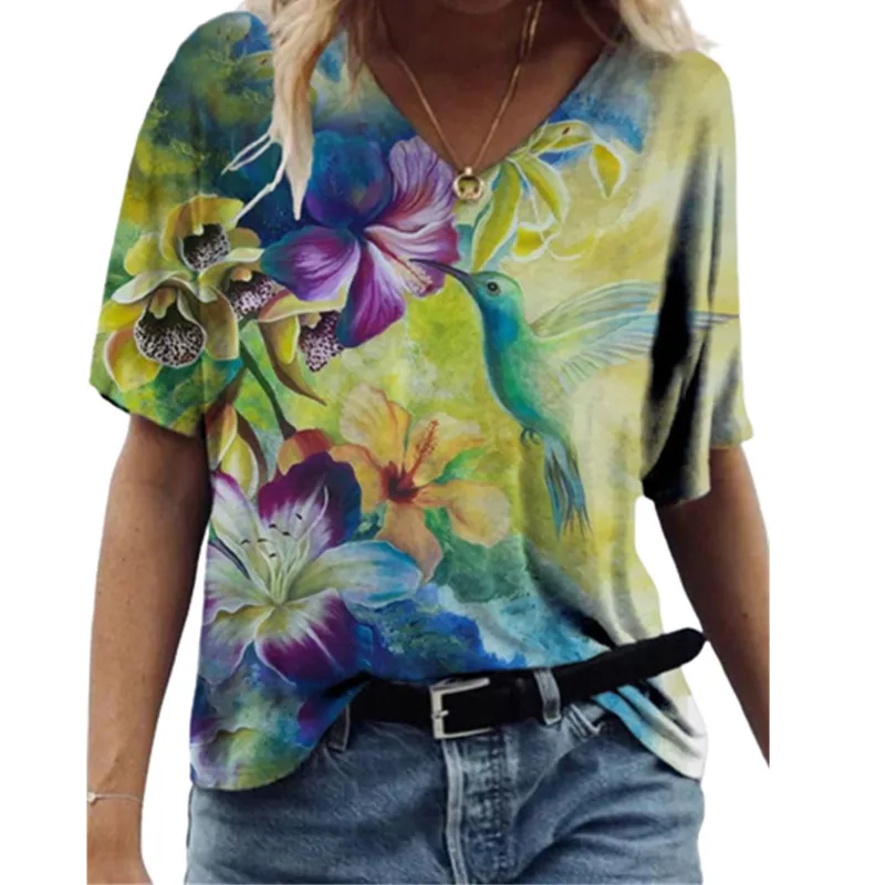 Женская футболка с коротким рукавом, V-образным вырезом и цветочным...