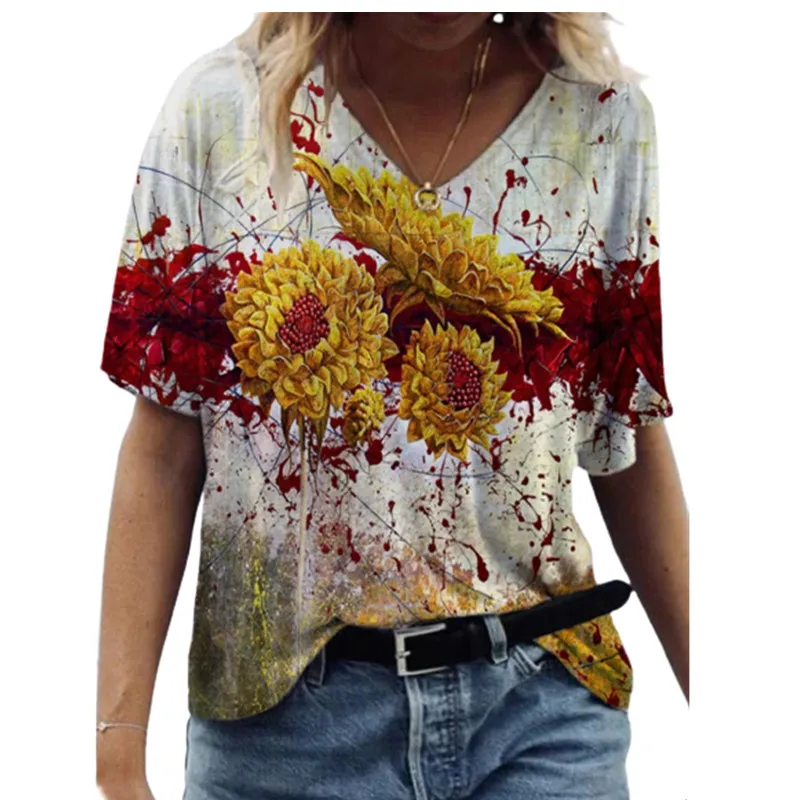 Женские топы с принтом подсолнухов, с 3D принтом тай-дай, лето 2021, Женская Повседневная футболка с коротким рукавом и V-образным вырезом, свободные футболки, размера плюс