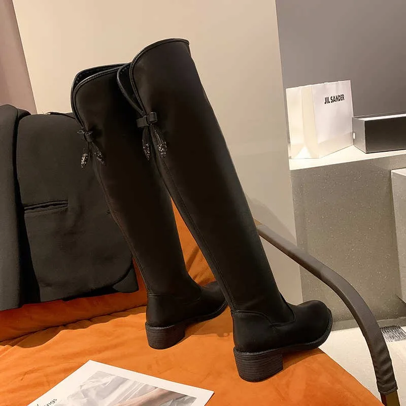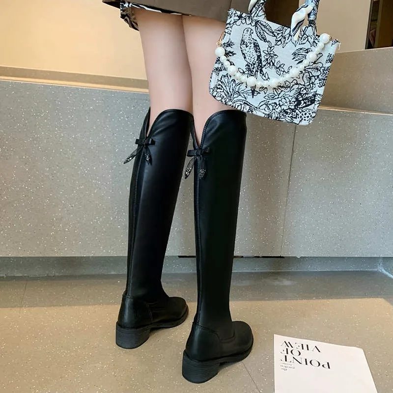 Женские флокированные сапоги до колена, с V-образным вырезом и бантом, на высоком каблуке, зимние, 2021