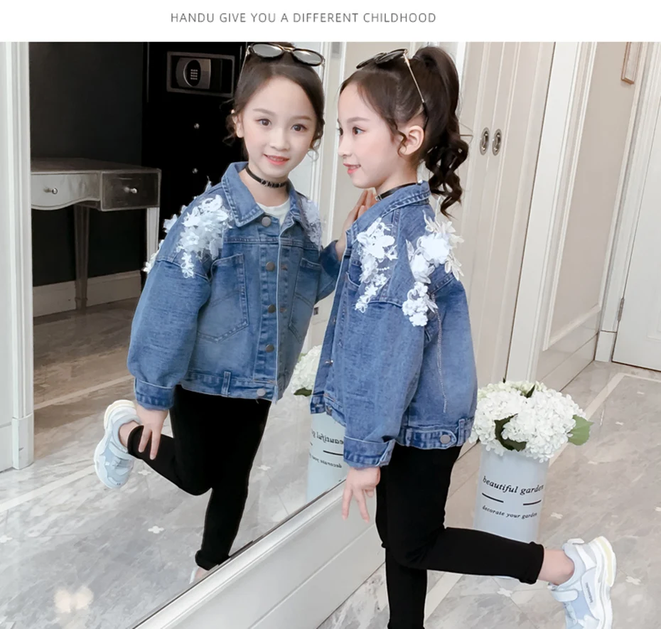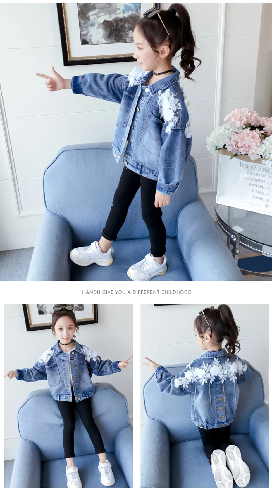 Джинсовая куртка для девочек, верхняя одежда, пальто для девочек с цветочной аппликацией, Детская Повседневная стильная верхняя одежда для детей, весенне-осенняя одежда для девочек