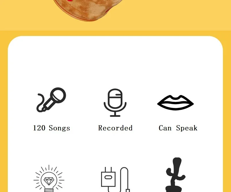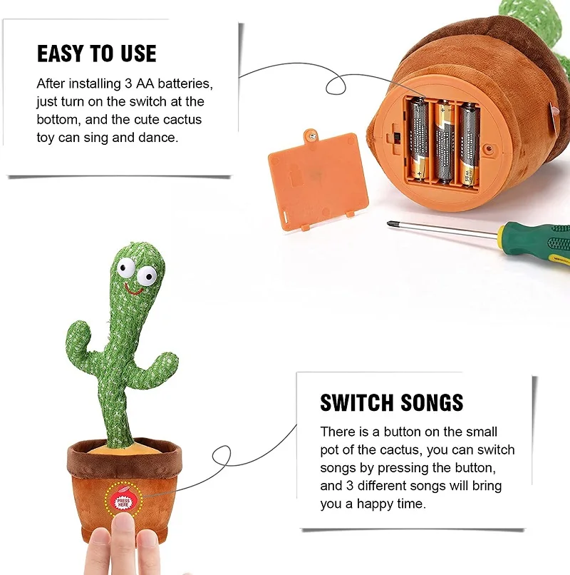 • Забавная танцевальная игрушка-кактус: танцующий кактус повторяет то, что вы говорите, танцует, поет (120 песен), имитирует, записывает, поворачивается, излучает светильник.• Высокое качество: забавный плюшевый кактус для танцев и пения, изготовленный из высококачественного милого плюша, мягкий и гладкий на ощупь.• Простота в использовании: Загрузите батарейки и нажмите кнопку, плюшевая игрушка кактуса будет кактуса и Пойте веселую песню.• Применение сценария: плюшевая игрушка кактус дарит лучший праздник, подарок на день рождения для детей. Веселая музыка и танцы очень подходят для создания приятной атмосферы и подходят для вечеринок.• Этот любопытный, выразительный кактус любит играть с вами в течение дня. В ночном режиме она издает глубокий сон и воспроизводит мягкую музыку. Она лучший друг днем и ночью!