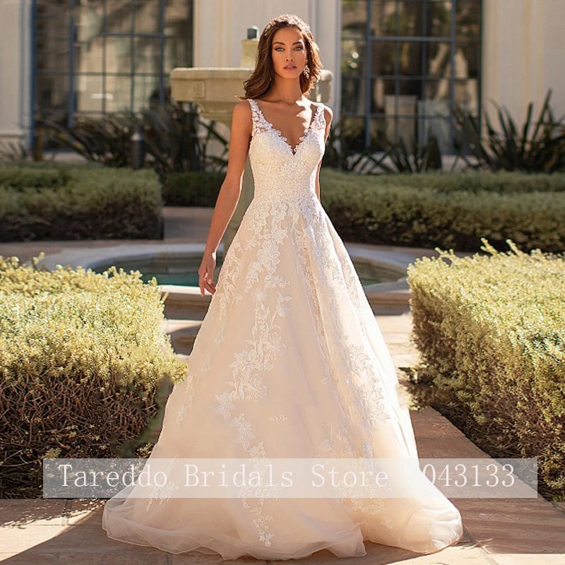 Новинка 2021, африканские Свадебные платья с V-образным вырезом, трапециевидные фатиновые платья с низкой посадкой и аппликацией, свадебные платья со шлейфом
