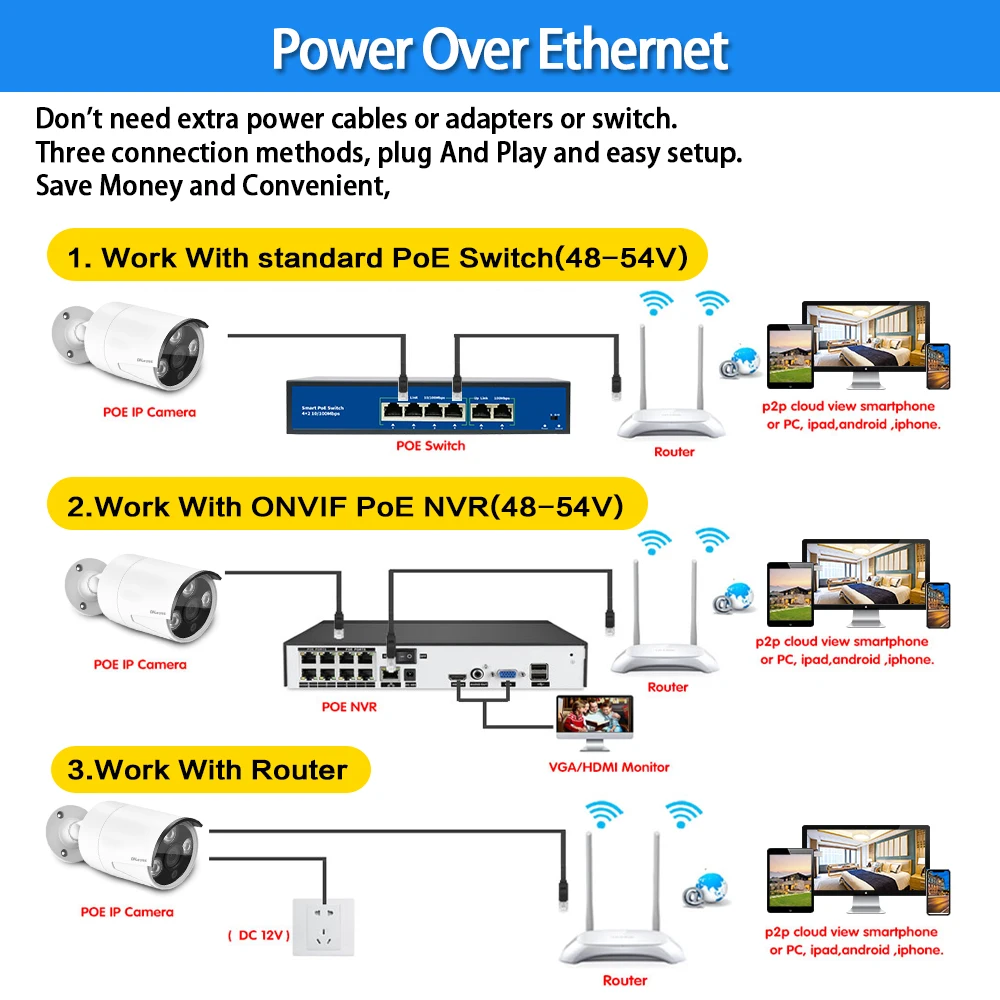 Нет дополнительных кабелей питания или адаптеров, просто подключив ip-камеру к NVR с помощью одного кабеля, вы можете легко завершить установку без знания о компьютере или сети и начать наслаждаться супер простым мониторингом среди вашего смартфона, планшета или ПК.Экономьте деньги и удобный POE NVR = NVR + POE коммутатор, подключи и работай и простая настройка!