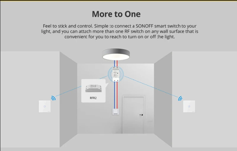 Дайте вам больше возможностей на светильник управления. В качестве радиочастотного выключателя 433 МГц он может соответствовать настенным переключателям SONOFF TX, которые могут светильник в двух разных положениях без необходимости подключения.