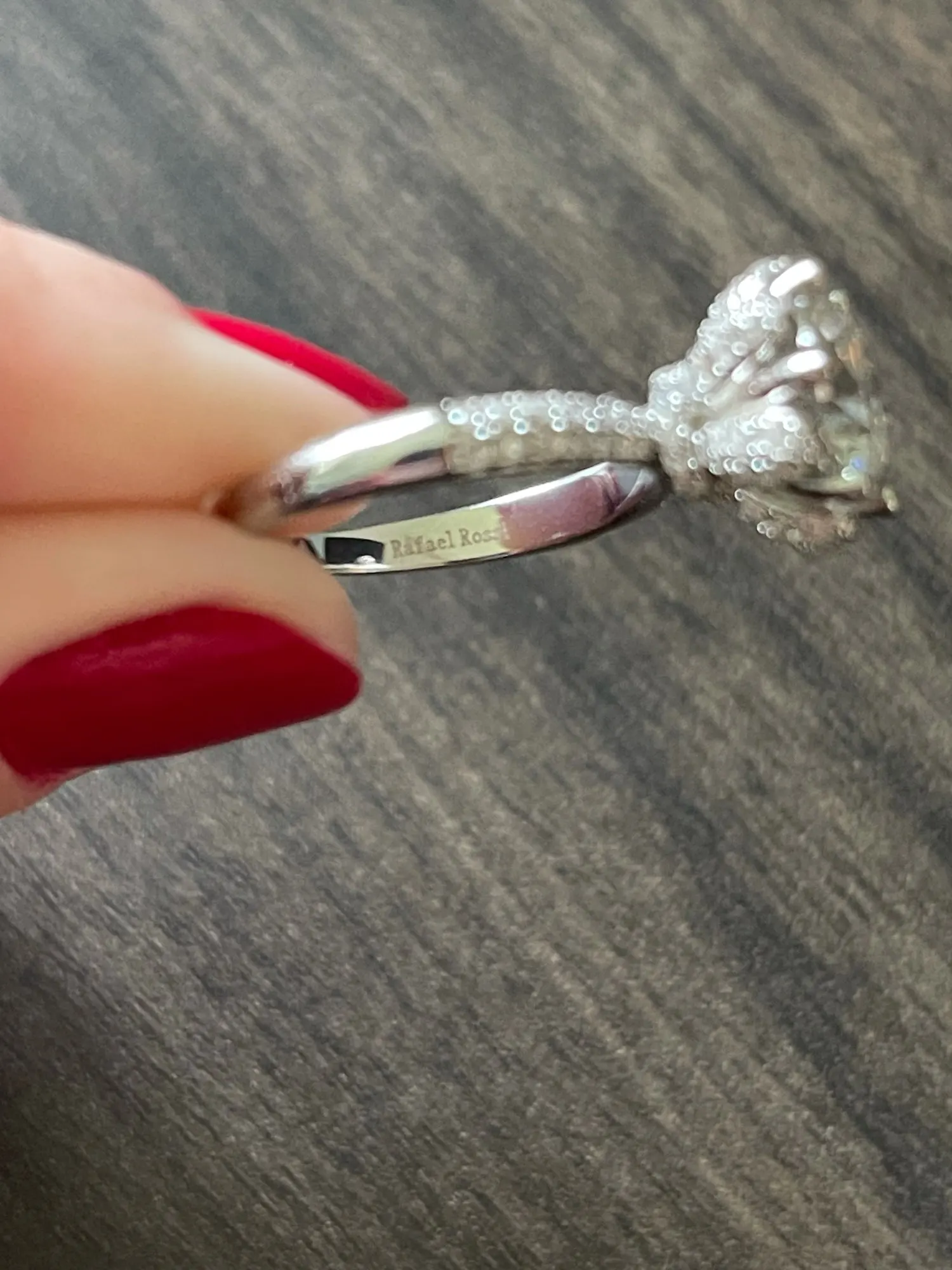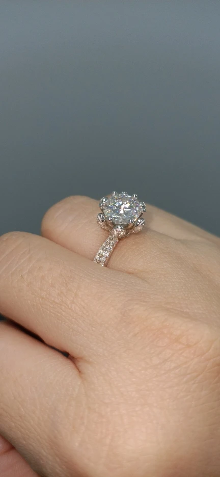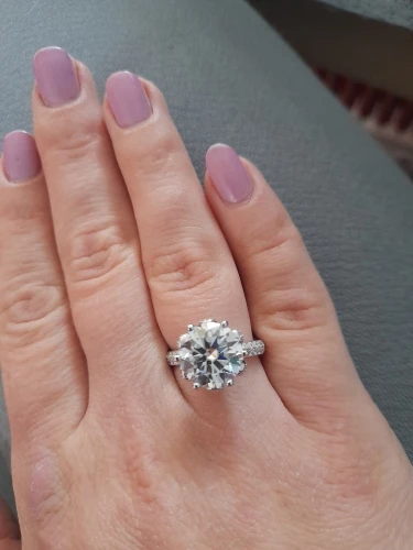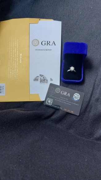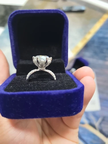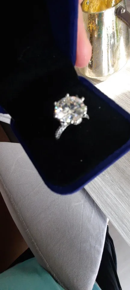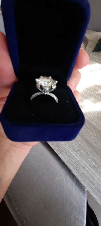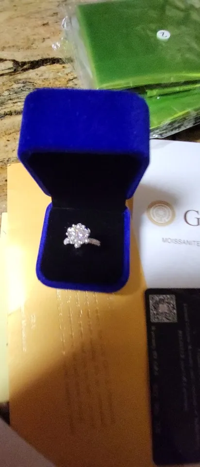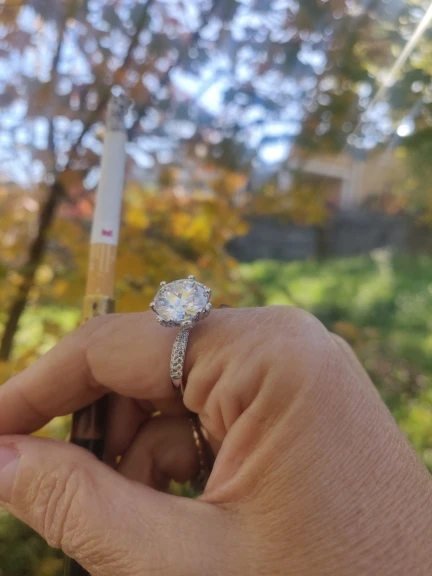 Очень величественное кольцо. Большинство 2ct и выше moissanite драгоценных камней слишком поддельные .... Но это очень блестящая вещь. Нельзя отличить от настоящего алмаза при естественном или внутреннем освещении.