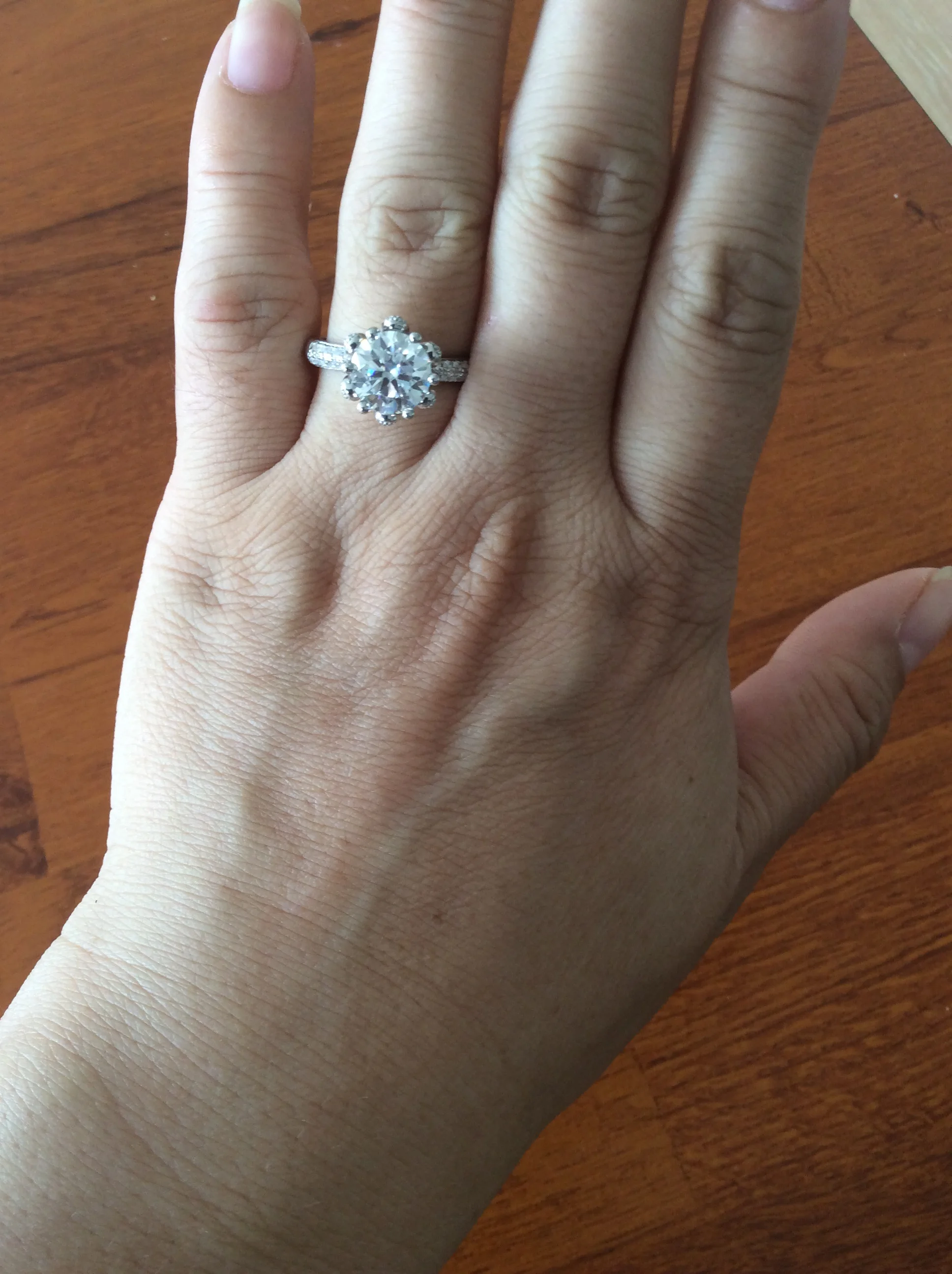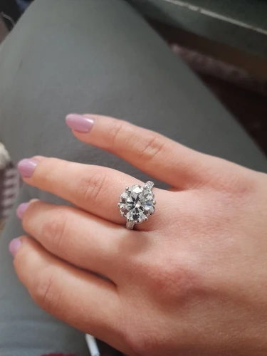 Кольцо красивое. Заказала камень 5каратов,очень большой камень и не так смотрится как бриллиант, лучше заказ 1кр. За сервис магазина поставила 3 звезды ,уже через три дня выполи 2 мелких боковых камня. Спор не открыла из-за того что неумею ставить фото .