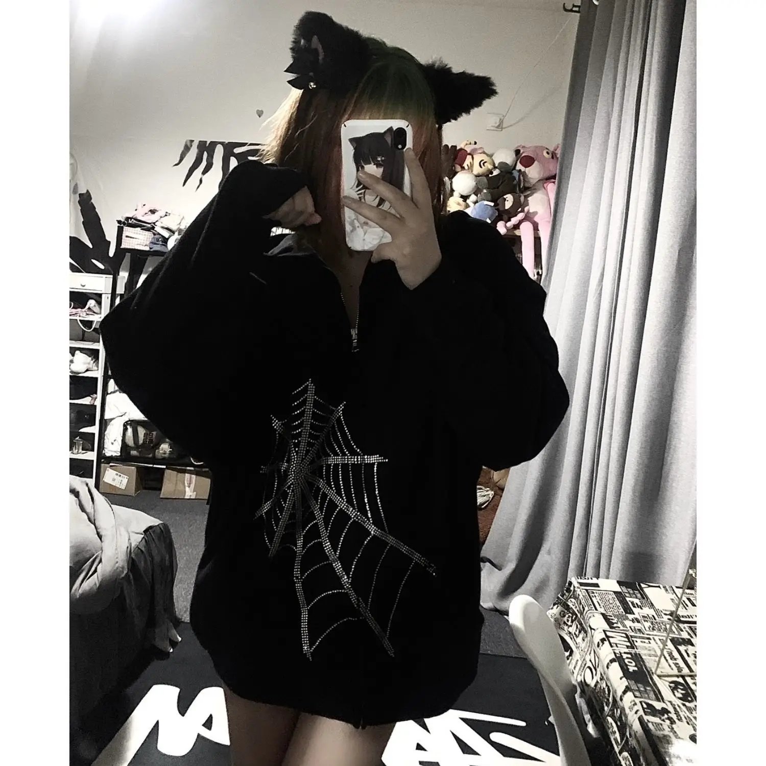 Стразы худи с паутиной застежкой Goth оверсайз Женская Осенняя Курт...