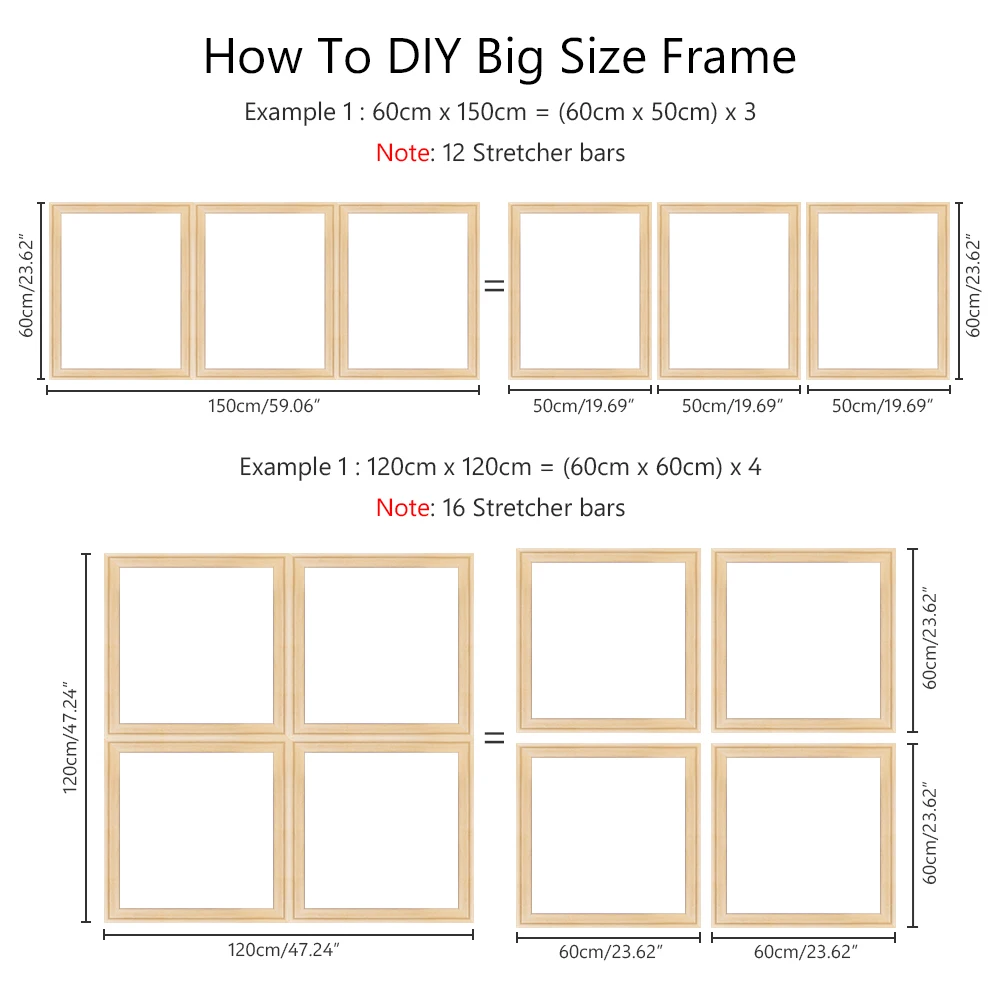 Легко собрать и сделать своими руками свой собственный холст растягивая систему, вручную кусок брусков вместе, а затем зафиксировать свои картины на рамке с тактиками или скобами (Не прилагаются).