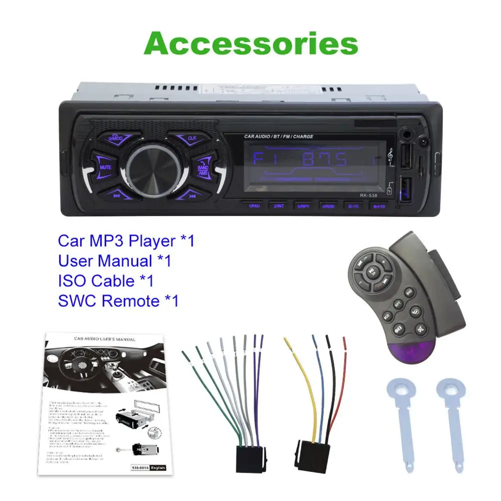 12V автомобиль WMA Беспроводной MP3 плеер dvd Авто Радио Стерео FM радио USB Зарядное устройство SWC дистанционное управление AUX TF SD карты 7 цветов, меняющие цвет ЖК-дисплей Экран дисплеяОсобенности продуктаДва usb-порта (одна воспроизведение музыки, одна поддержка быстрой зарядки телефона)1 синий зуб MP3 со слотом для карт SD/MMC, с 2 usb-портом2. Поддержка функции быстрой зарядки телефона3 Поддержка макс. 32G расширение карты памяти (включая высокоскоростную usb-передачу)4 Поддержка формата воспроизведения MP3/WMA5 FM диапазон: 87,50 МГц ~ 108,00 МГц6 Стерео электронный тюнер, сканирование и хранение станций автоматически7 электронных тюнингов, более 3 полос (FM1,FM2,FM3) и 18 предустановленных станций8 выключение питания с функцией автоматического хранения памяти в режиме радио или SD/USB/AUX.9 7 цветов подсветки ЖК-дисплей (автоматическое изменение или DIY)Эффект эквалайзера 10: Рок/Поп/класс11 Mosfet: высокая выходная мощность12 многофункциональный ИК-пульт дистанционного управления, бесшумное управление13 4 RCA аудио выход14 ISO Соединитель с кабелем15 Источник питания: Совместимость 12 В постоянного токаПримечания:1. Продукт совместим с автомобилем 12 В. Не 24 В.2. Этот продукт не поддерживает воспроизведение CD, VCD и DVD дисков.Параметры продуктаТип: автомобильный mp3-плеерЦвет: как показаноМатериал: пластик + металл + электронный оригиналИнтерфейс: интерфейс питания ISOРазмер: около 188*58*76 ммУпаковочный лист:1 * автомобильный стерео аудио mp3-плеер1 * ISO кабель1 * пульт дистанционного управления1 * Руководство пользователя на английском языке
