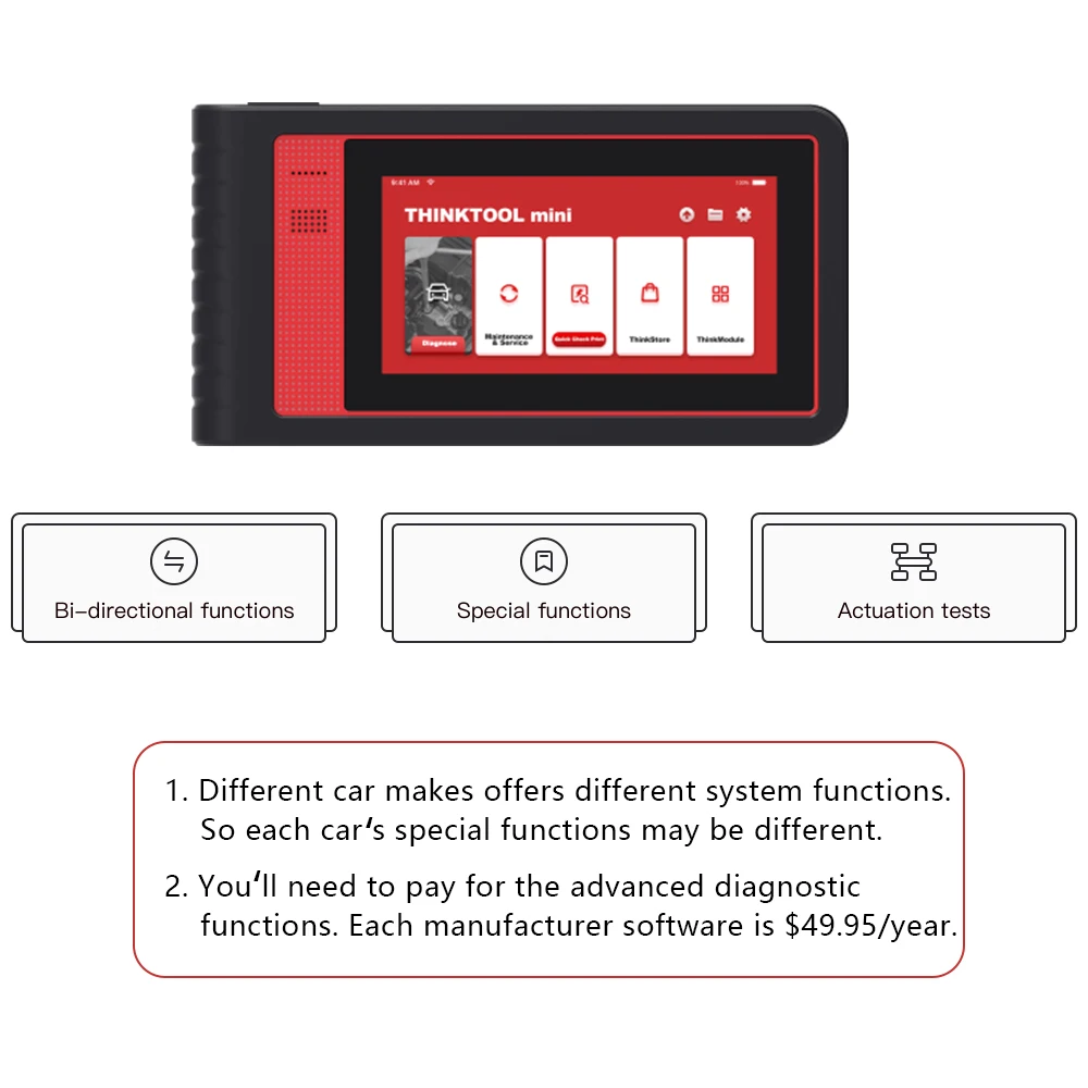Thinktool mini, как диагностическое устройство OBD II высшего уровня для пользователей DIY, поддерживаемое, включает считывание кода/очистку потока данных, испытание на приведение в действие, специальные функции и т. д.1. Бесплатное считывание кода в системе, очистка кода, потоковая передача данных и обновления для всех моделей.2. Функция полного сброса бесплатна для использования (в настоящее время 28 и будет увеличена до более поздней).3. После подписки на программное обеспечение, вся система может быть диагностирована с полными функциями (экшен-тест, специальная функция, cding может быть осуществлена).4. Система Android может быть обновлена онлайн.5. Вся система диагностирует более 93 автомобильных брендов.6. Диагностика охватывает все модели, поддерживающие протокол OBD после 1996 года.7. Оснащен интеллектуальными идентификационными моделями с кодом VIN.8. Дизайн серии THINKCAR, пылезащитный, ударопрочный, легко хранить9.5.99 дюймовый дисплей удобен для диагностики автомобиля в режиме реального времени10,2G RAM/ 32G ROM, поддержка Bluetooth и WiFi подключения11. Оплатите один автомобиль модель программного обеспечения может наслаждаться бесплатным обновлением 1 год полной системы, такие как: ECU кодирование/экшен тест и другие специальные функцииСтоимость: $49,95/год (вы можете купить напрямую из ThinkCar Store)
