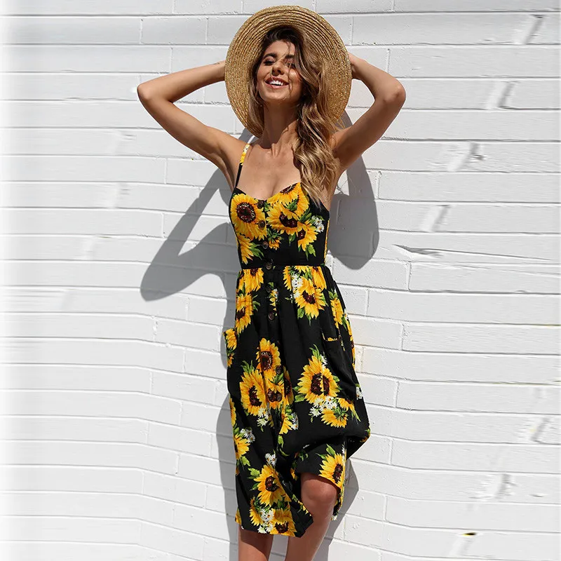 Женское пляжное платье с принтом в виде подсолнухов, большого размера, с карманами, на пуговицах, 2021, сексуальное платье-комбинация, лето, S-3XL
