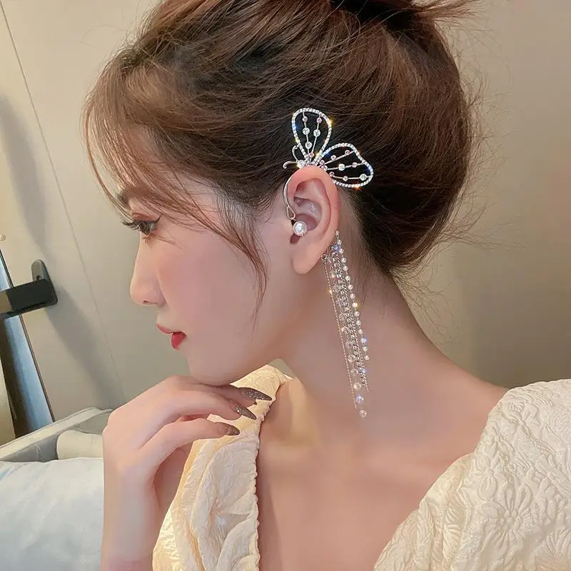 Название: 2021 модные Висячие серьги-бабочки, сплав, клипсы для ушей без перфорации, Серебряные длинные кисточки для женщин, изысканные ювелирные изделия