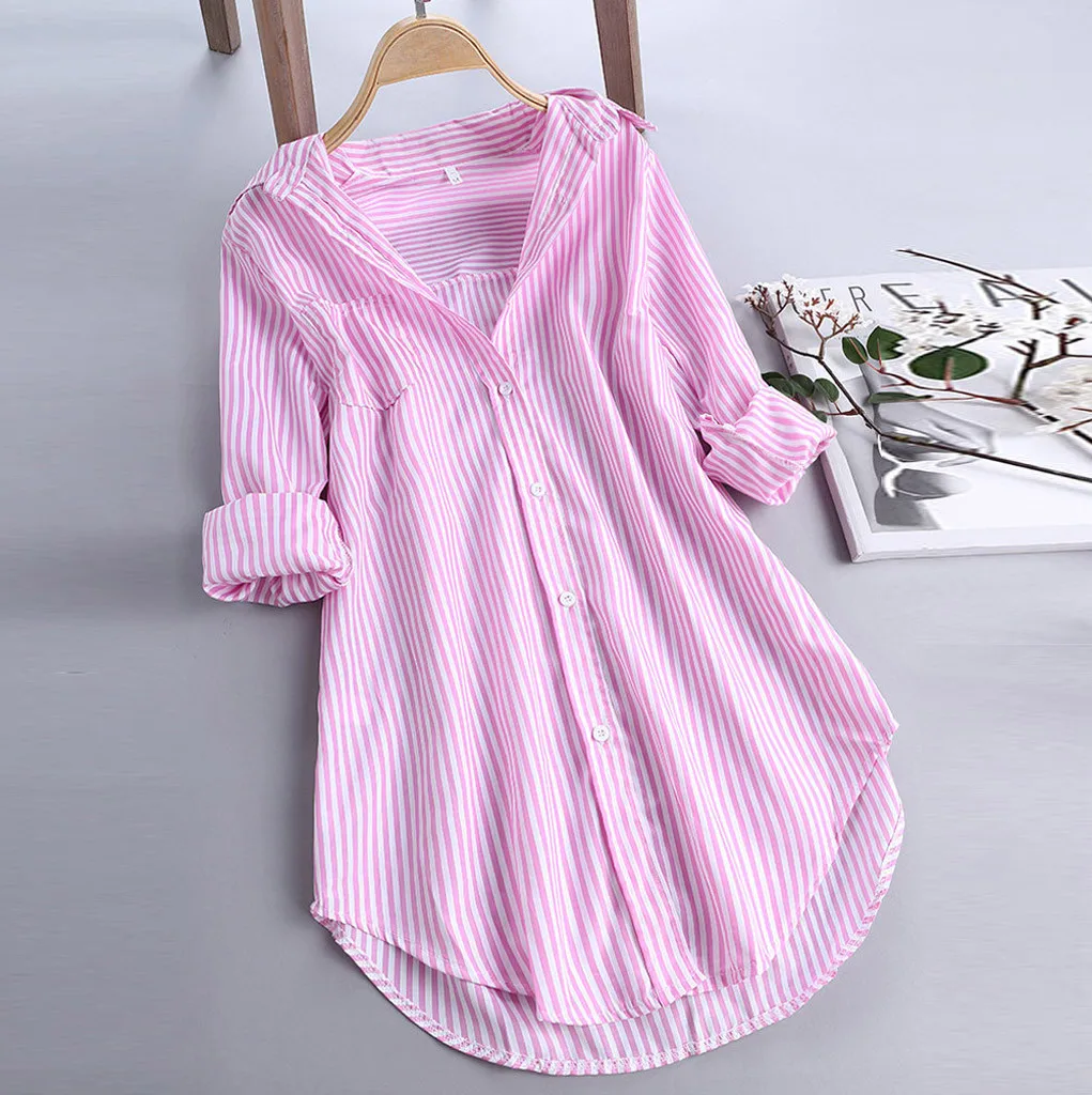 Женская блузка в полоску с длинным рукавом и отложным воротником на пуговицах