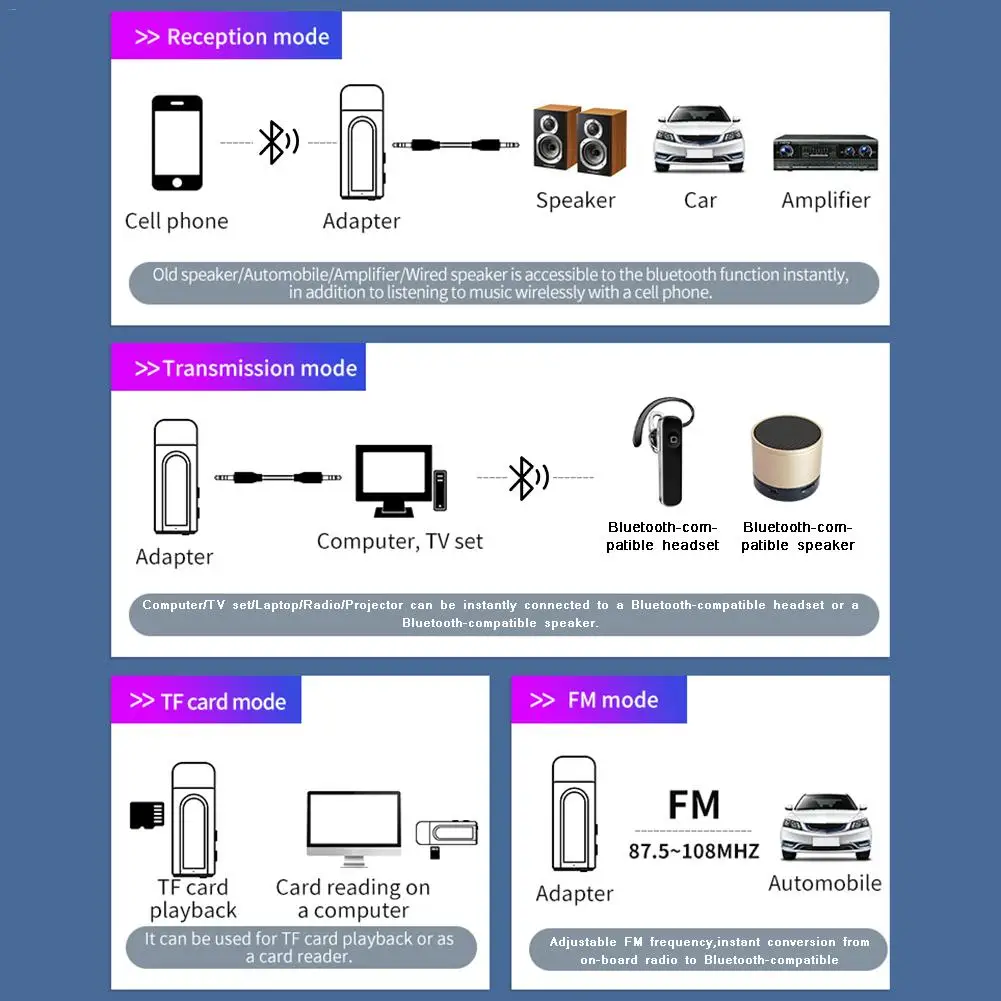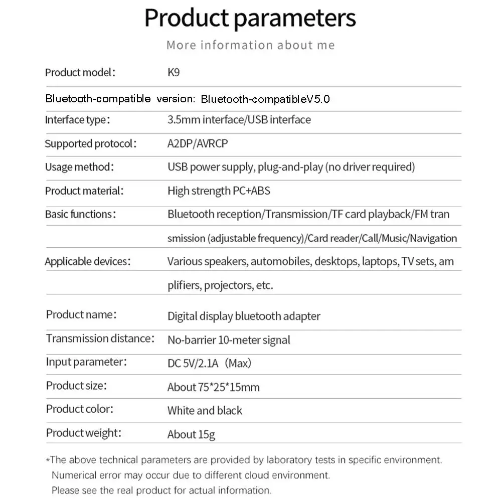 1. Новый дизайн: приемник Blueteeth с светодиодный дисплеем.2. Приемник Blueteeth 5,0: установлен с Blueteeth 5. Чип, Новый Беспроводной приемный приемник VIKEFON имеет непревзойденную производительность с более быстрой скоростью передачи 2x, более высокой стабильностью подключения, на 10 м выше, чем знак предыдущей версии.3. Передатчик приемник режим: конструкция «2 в 1, с помощью этого беспроводного, адаптер, можете отправить нам сообщение, вы можете отправить нам и принимает все звуковые свободно и легко. Передатчик позволяет вашему телевизору, av-ресиверу, радио-и мобильному устройству использовать громкоговорители Blueteeth headp honesor; приемник позволяет не Blueteeth устройств, таких как вашей домашней стереосистеме или AV ресивер для беспроводной потоковой передачи музыки с вашего мобильного телефона мобильный телефон/шт.4. Fm-передатчик: (87,5-108 МГц) светодиодный дисплей.5. С микрофоном: свободные руки при звонке, говорящая на пике во время вождения.6. Кард-ридер и передача данных: можно распознать tf-карту.Характеристики:Интерфейс: 3,5 ммВход: параметр: DC5V / 2.1AПоддержка: протокол: A2DP / AVRCPРазмер: около 6,7*2,2*1,2 мм/0,26*0,08 * 0.05inМатериал: Поликарбонат + АБС-пластик высокой интенсивностиВес: около 15 г/100 гОсновные функции: прием Blueteeth, fm-радио (87,5-108 МГц), передача Blueteeth, воспроизведение tf-карт и хранение данныхПоддержка устройств: мобильный телефон/автомобиль/планшет/компьютер/проводной динамик/усилитель/проекторУпаковочный лист:Передатчик и приемник Blueteeth-1 шт.1 х кабель аудио 3,5 мм1 X Руководство пользователя