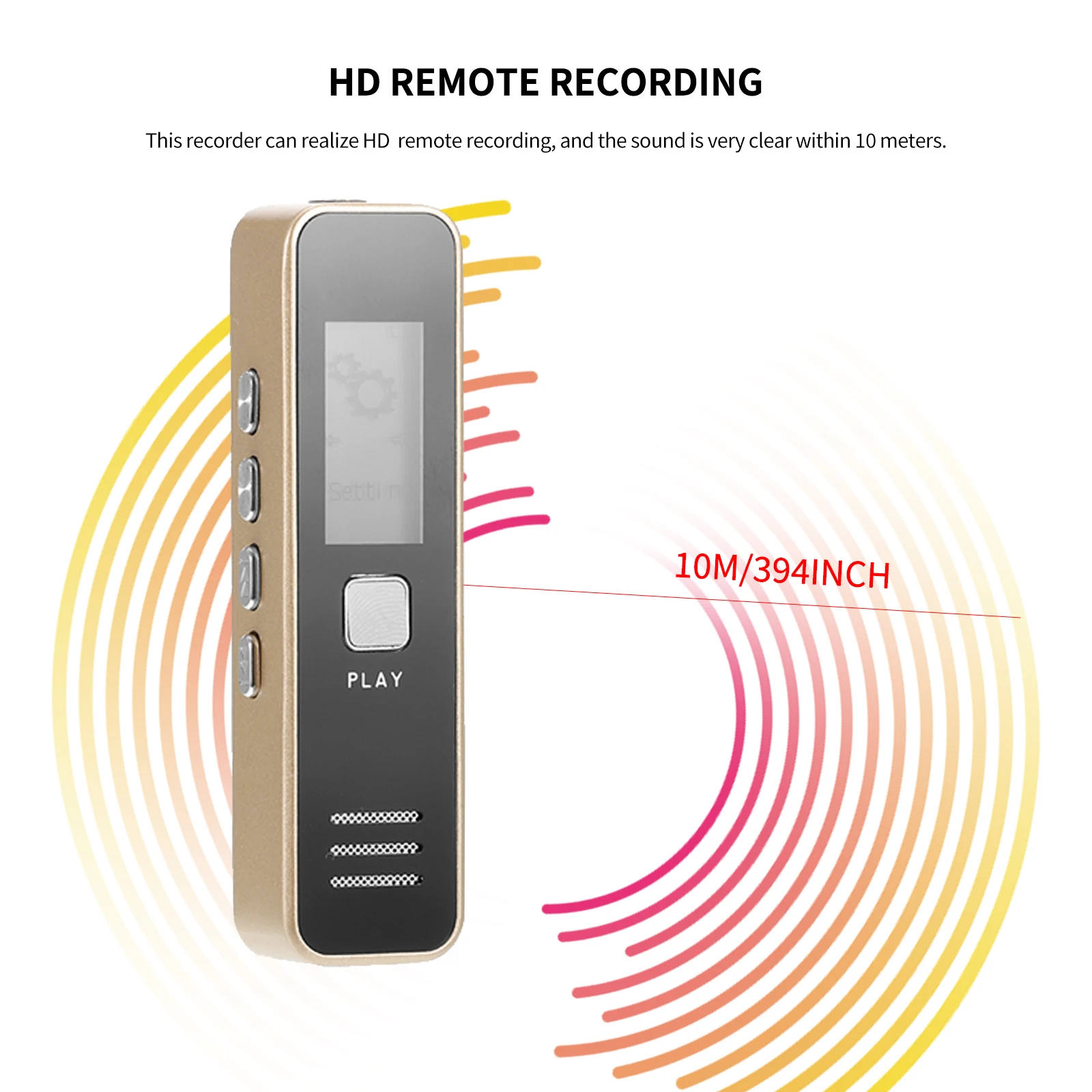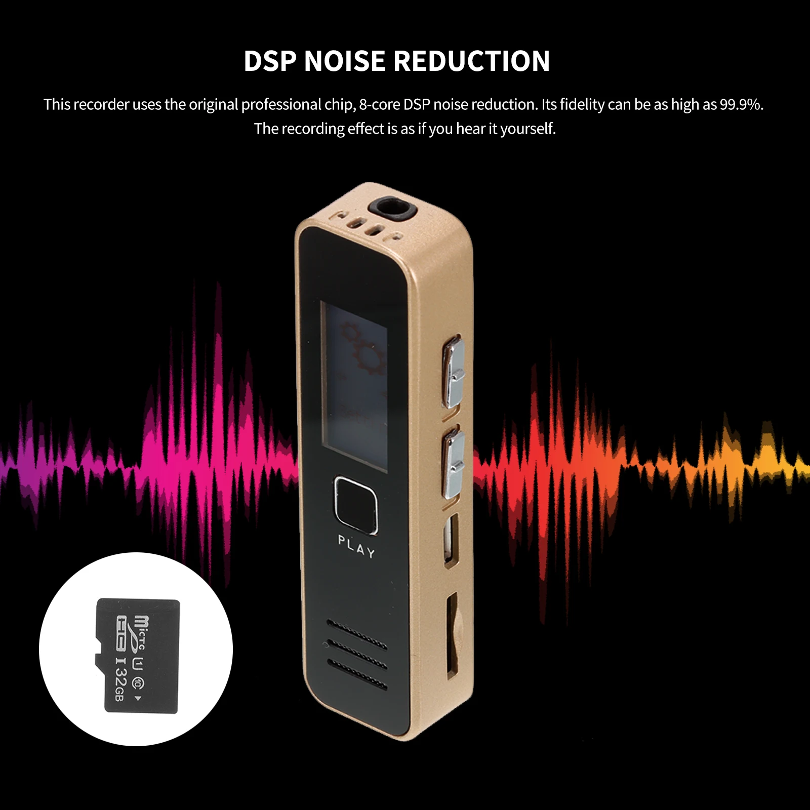 Особенности:HD удаленная записьЭтот рекордер может осуществлять удаленную Запись HD, и звук очень четкий в пределах 10 метров.Шумоподавление DSPЭтот регистратор использует оригинальный профессиональный чип, 8-ядерный DSP подавление шума. Его точность может быть выше 99.9%. Эффект записи выглядит так, как будто вы сами его слышите.Долгое время записиЭтот рекордер имеет чрезвычайно длительное время записи и может записываться до 1200 минут. Более того, его Настройка пароля защищает файлы записи.Функция воспроизведения MP3У этого регистратора есть функция воспроизведения MP3. Кроме записи голоса, вы также можете слушать музыку. Вы можете легко выбрать то, что вам нужно.Различные режимыЭтот рекордер имеет различные режимы для вас на выбор. Вы можете свободно переключаться между циклическим режимом, звуковым режимом и повторяющимся режимом. Кроме того, для этого рекордера доступно пять качественных записей, 32KBPS-384KBPS.ПрименениеЭтот рекордер подходит для обучения в классе, деловых переговоров, развлекательных путешествий и других сцен. Характеристики:Тип: диктофонМатериал: пластикЦвет: черный/золотистыйКоличество: 1 шт.Модель: с картой памяти 32 Гб/без карты памяти 32 ГбДисплей: 1,2 дюйма (OLED со сверхвысоким разрешением Ultra HD)Батарея: 3,7 V/200 мА литиевая батарея БатареяФормат воспроизведения: музыкальный форматСкорость потока: MP3.8-320 кбит/с WMA. 32-192kbpsОтношение сигнал-шум: >80 дБРазмеры: около 7,2*2,0*0,8 см/2,83*0,78 * 0.31inПосылка Размеры: 10*7,5*4,5 см/3,93*2,95 * 1.77inВес: 120 г/4,23 унций Посылка:1 * диктофон/1 * диктофон + карта памяти 32 Гб1 * USB кабель для зарядки1 * Руководство пользователя
