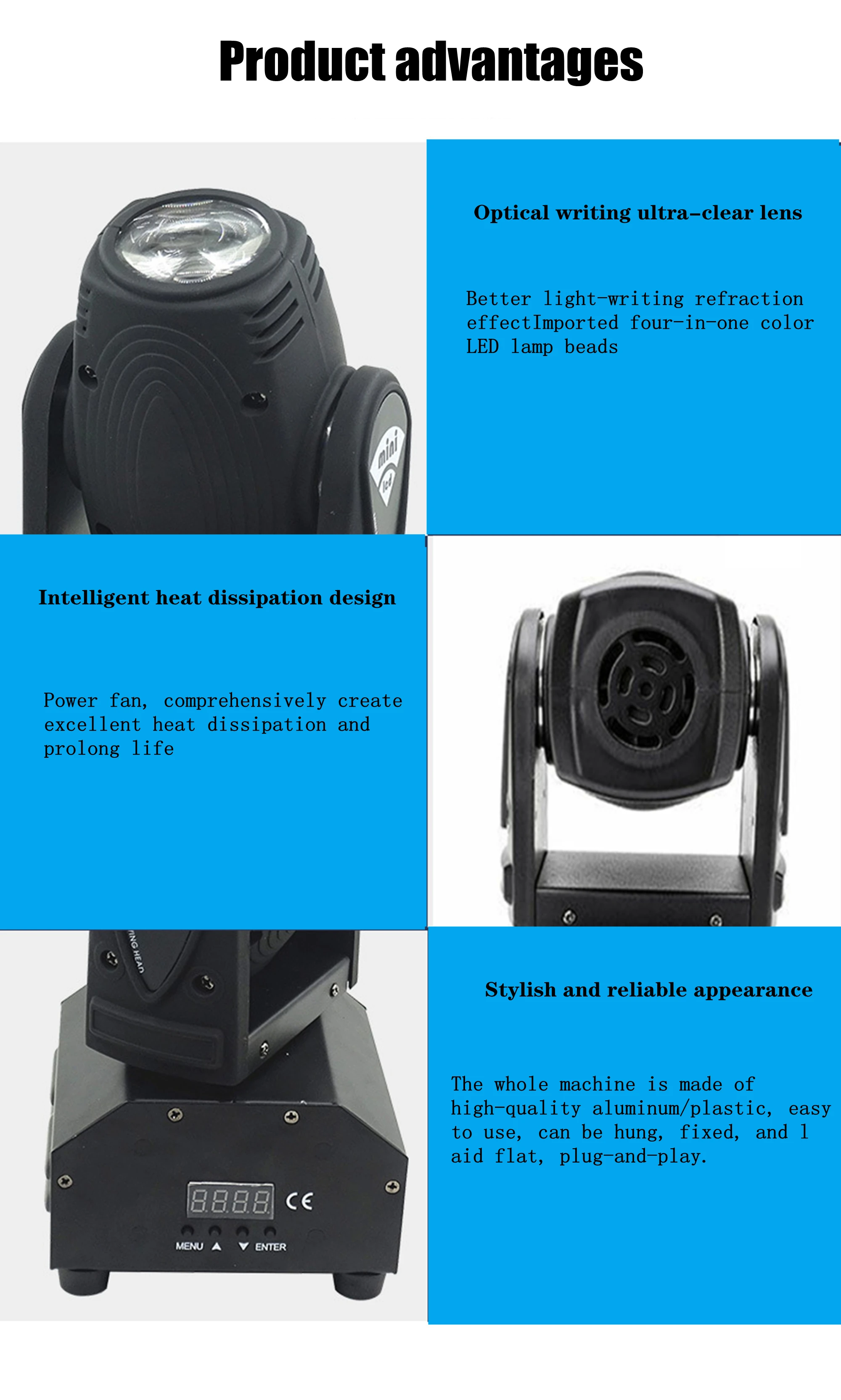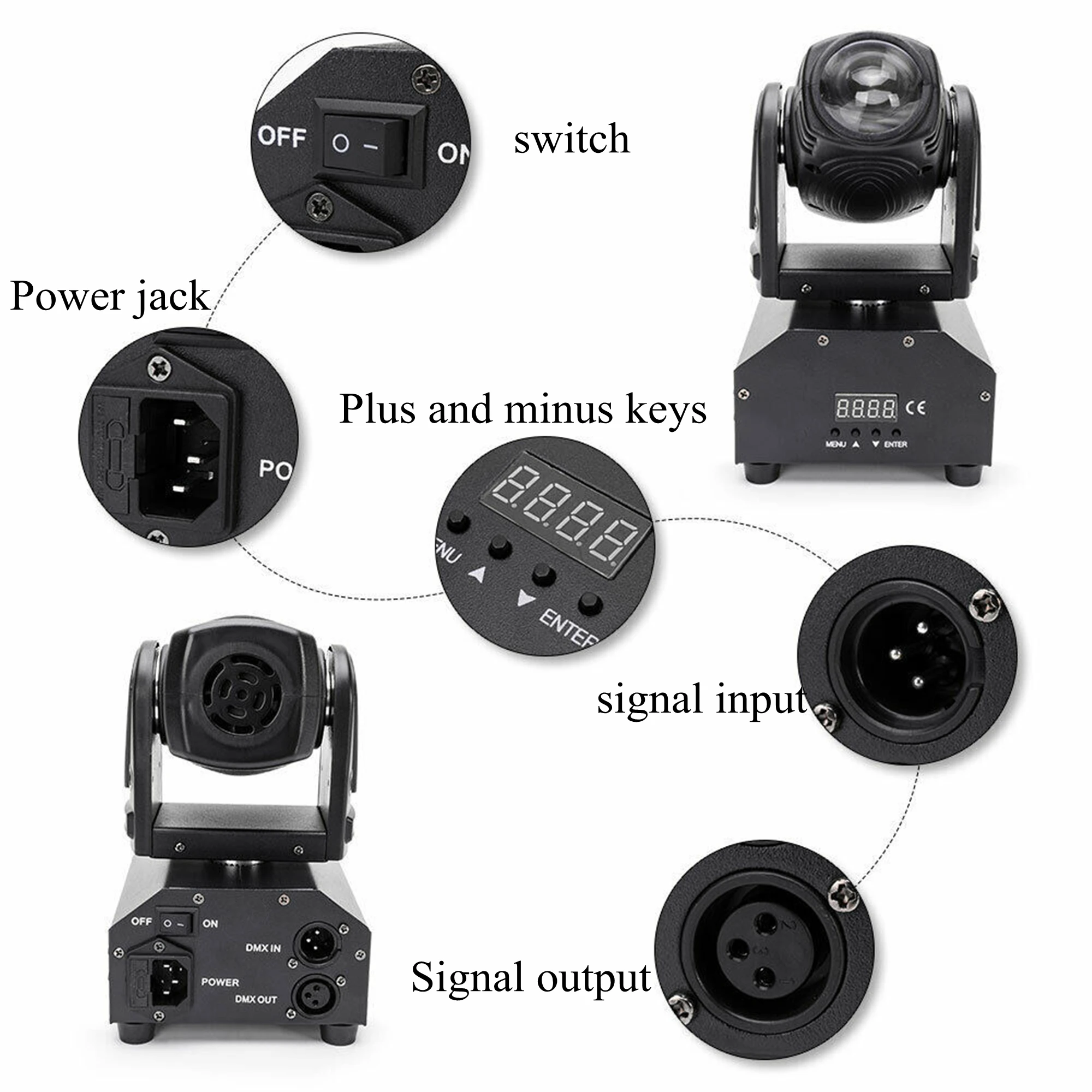 * Напряжение: AC90--240V,50-60 Гц* Полная мощность: 60 Вт* Светодиодный источник: 60 Вт светодиодный HAUTE puission* Canaux de contróle DMX: 9/11 canaux DMX* Панорамирование/наклон: 540/180 градусов* Angle de l'objectif: 45 degrés* Couleurs: 7 couleurs + blanc* Rhéostat: 0-100% mécanicien gradateur* Roue des couleurs: 8 couleurs + effet demi-couleur + vitesse de rotation des couleurs. Вращение infinie* Roue de Gobo: 8 gobos + secousse + Gobo vitesse de rotation. Вращение infinie
