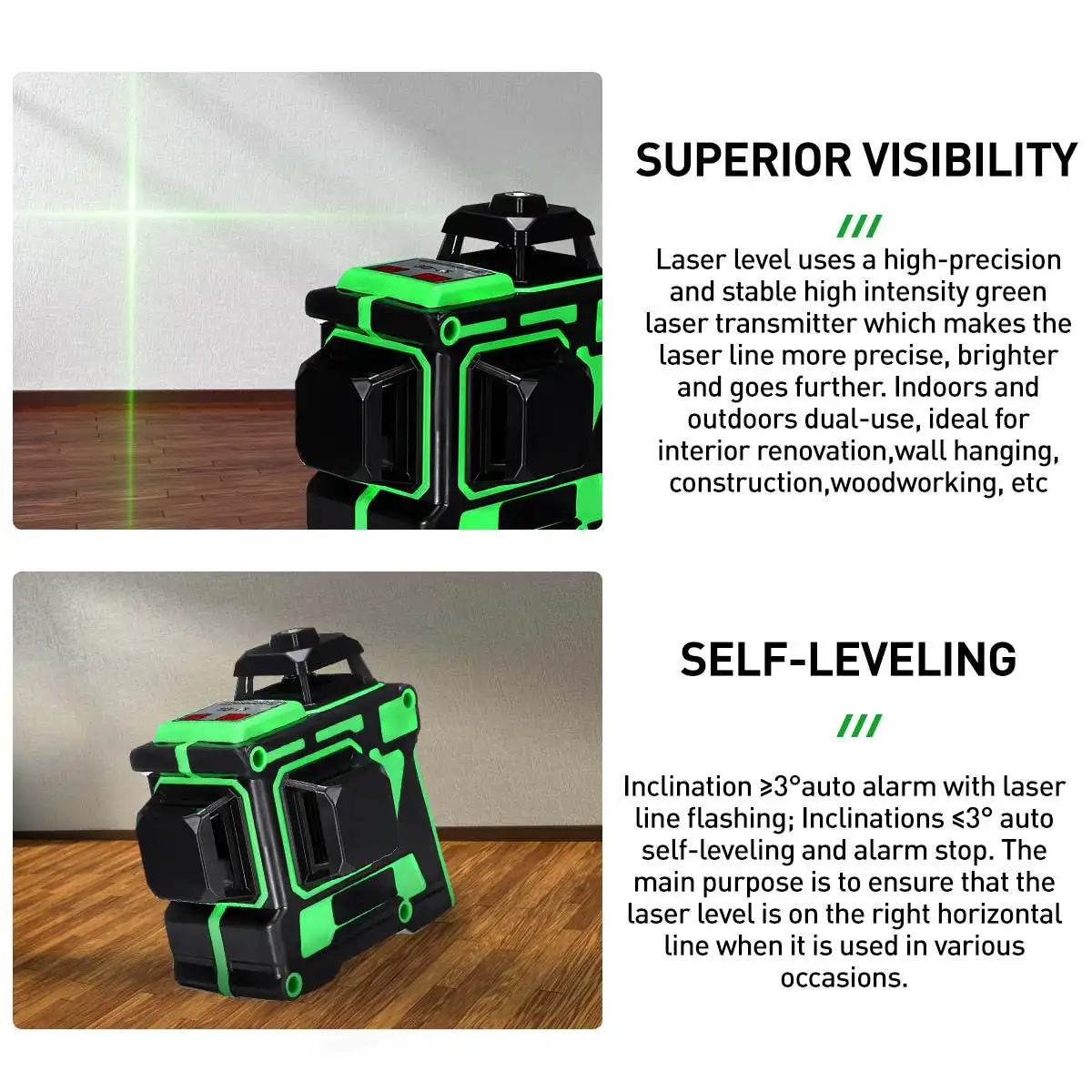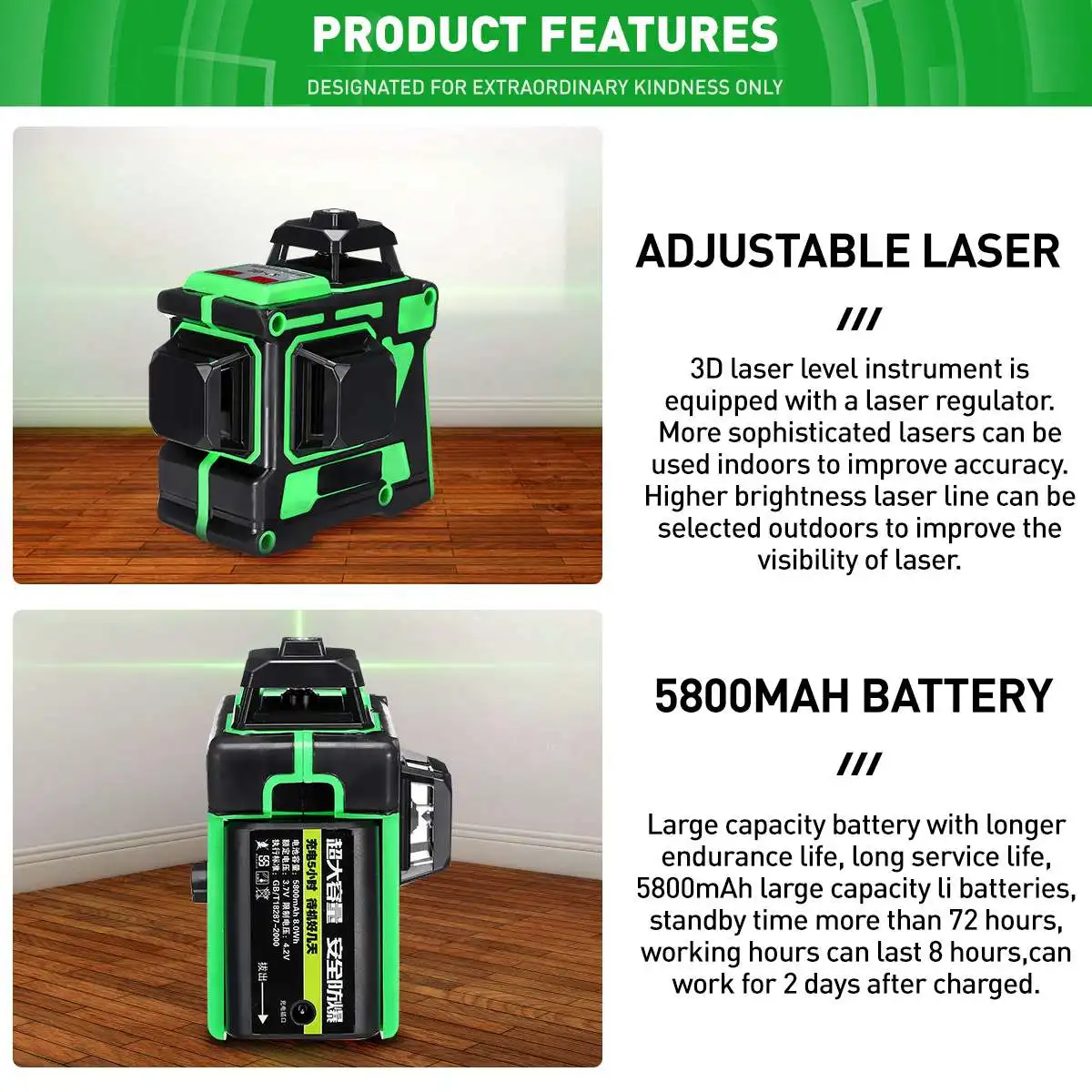 Лазерный уровень, 12 линий, 3D уровень, самонивелирующийся, 360 градусов, горизонтальный и вертикальный перекрестный супермощный лазерный уровень зеленого цвета