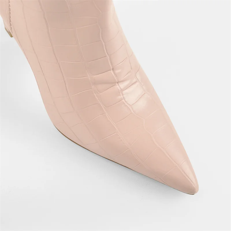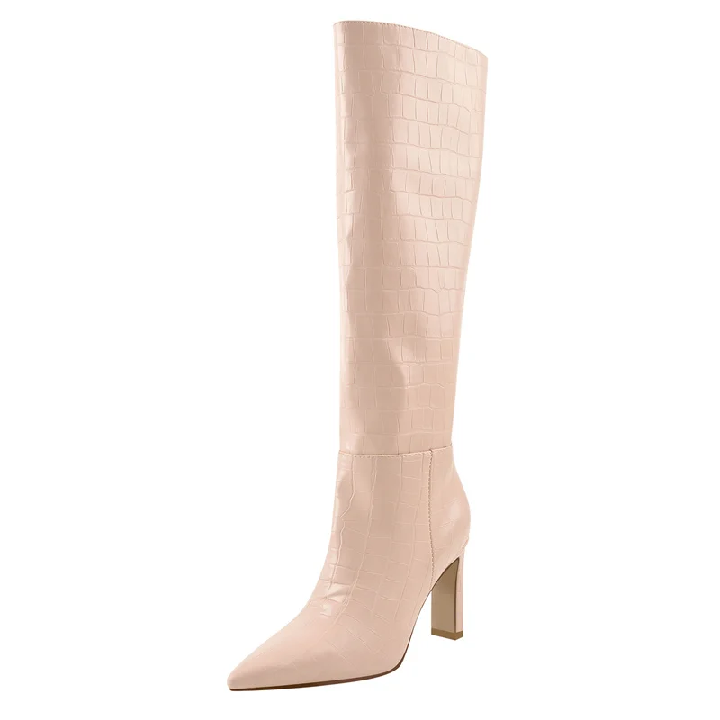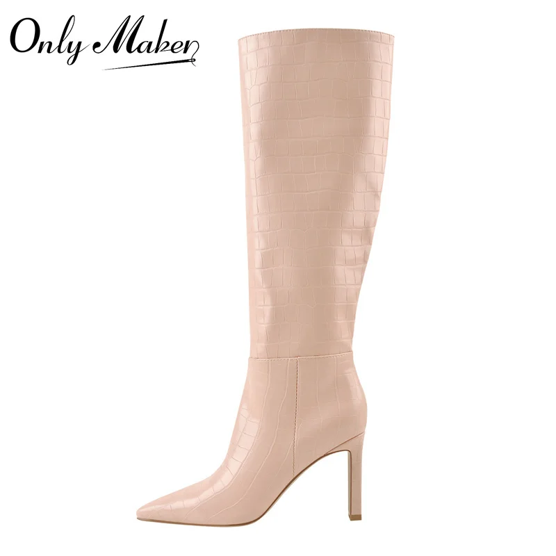 Onlymakerвесенние женские сапоги до колена с острым носком; Матовые розовые высокие сапоги с крокодиловым принтом на не сужающемся книзу массивном высоком каблуке; Милые осенние выразительные сапоги