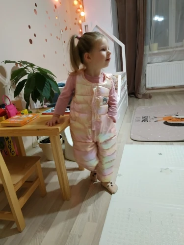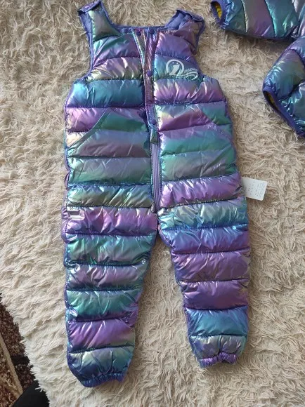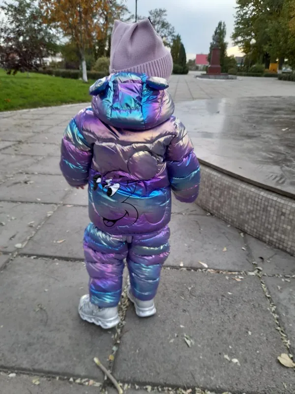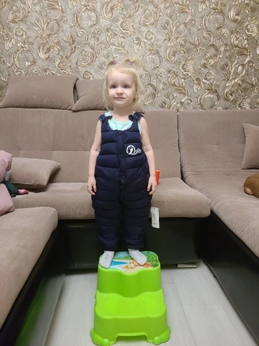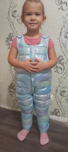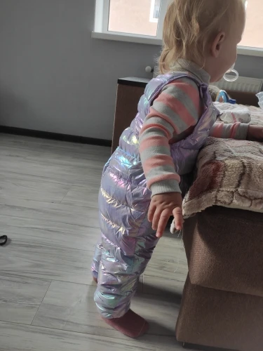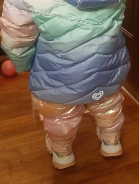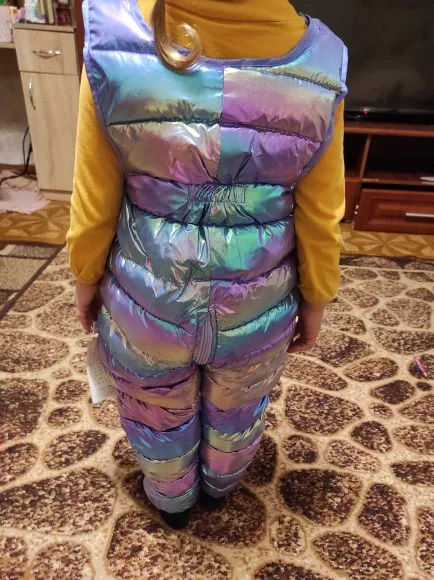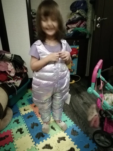 Цвет соответствует картинке, розово-желто-сиреневый отлив, штаны толстенькие, красивые, верхняя ткань плотная, капли скатываются. Верхняя часть полукомбинезона застёгивается на 3 кнопки, молния начинается в нижней части, а заканчивается на пояснице), не знаю зачем) Размер 3 Т большой на 82 см, 1,8 г. Есть одно но, они очень странно складываются на ребенке из-за узкой резинки внизу. Причем в сапоги не влезет и сверху на сапог не оденешь штанину, а вряд ли кто-то зимой в кедах ходит. Доставка 18 дней.