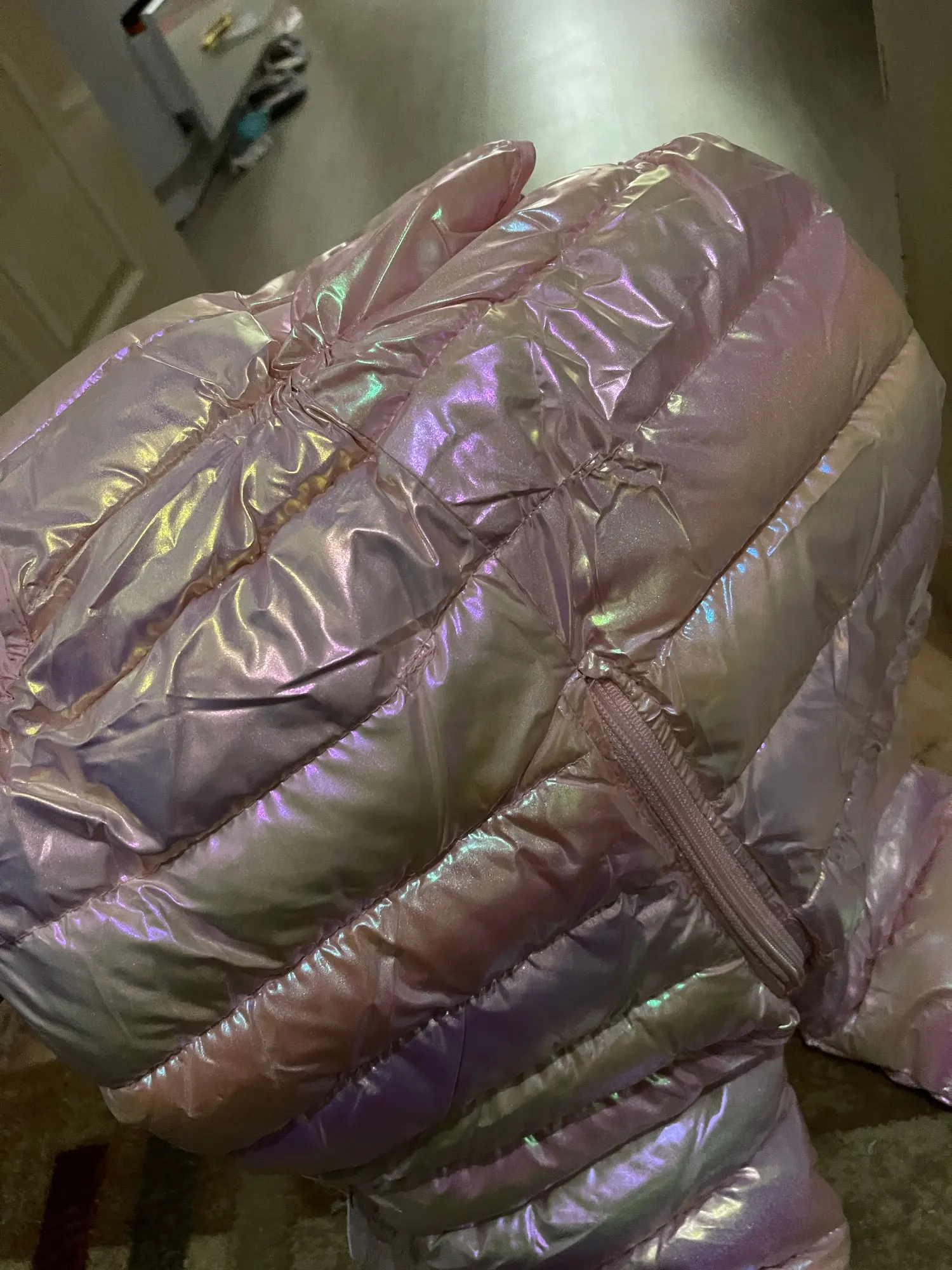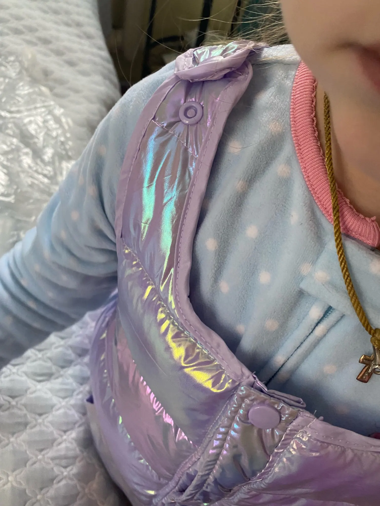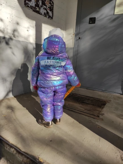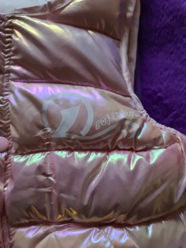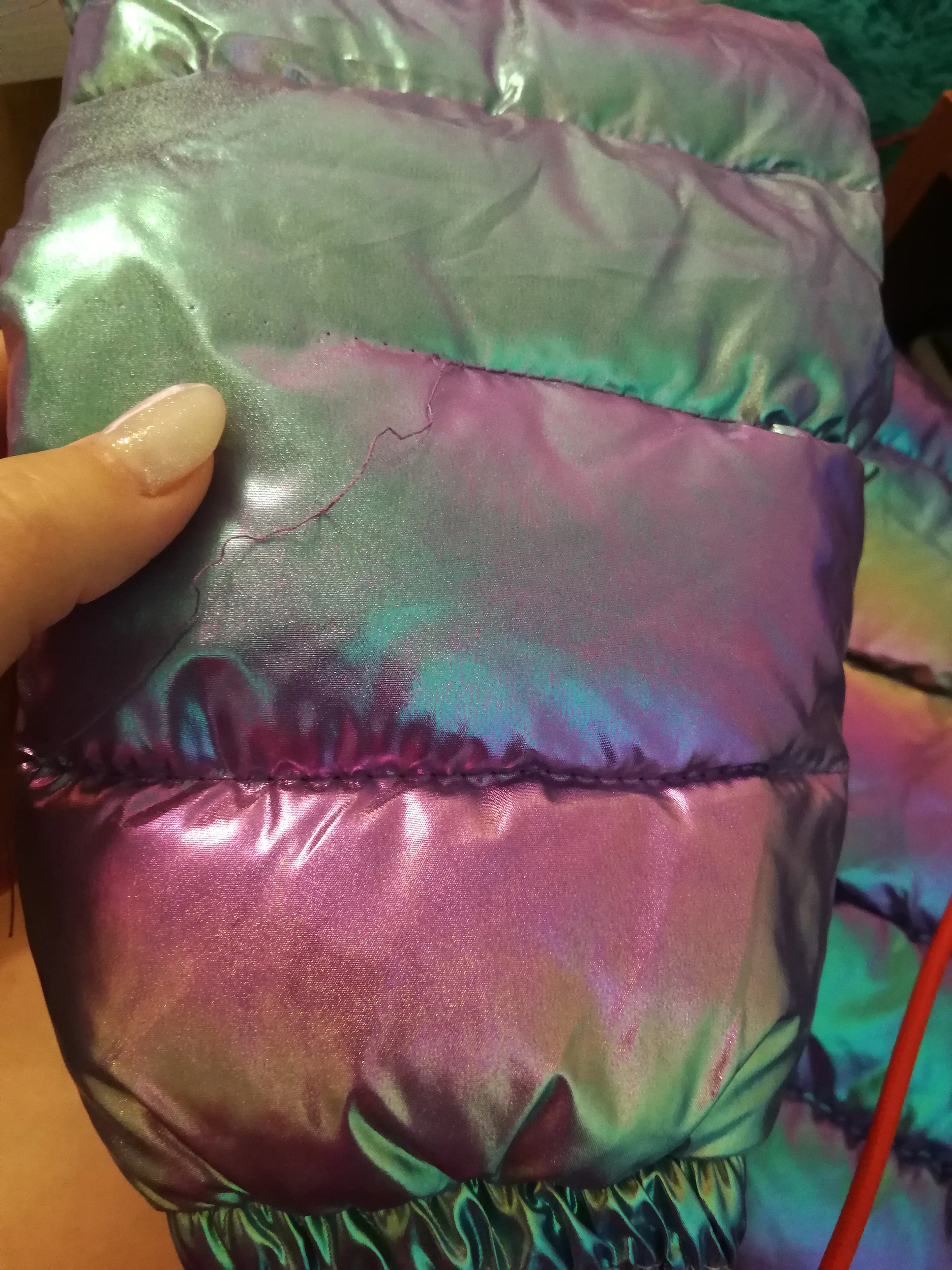Думала будет ближе к серебристому , а оказалось больше сиреневый , не очень подойдёт под куртку ( но очень красиво смотрится !))) переливается . Ребёнок заценил . У нас рост 104 . 110 размер впритык на первой кнопочке. Надеюсь до весны не станет мал )) швы аккуратные , наполнитель плотный . В общем нравится .