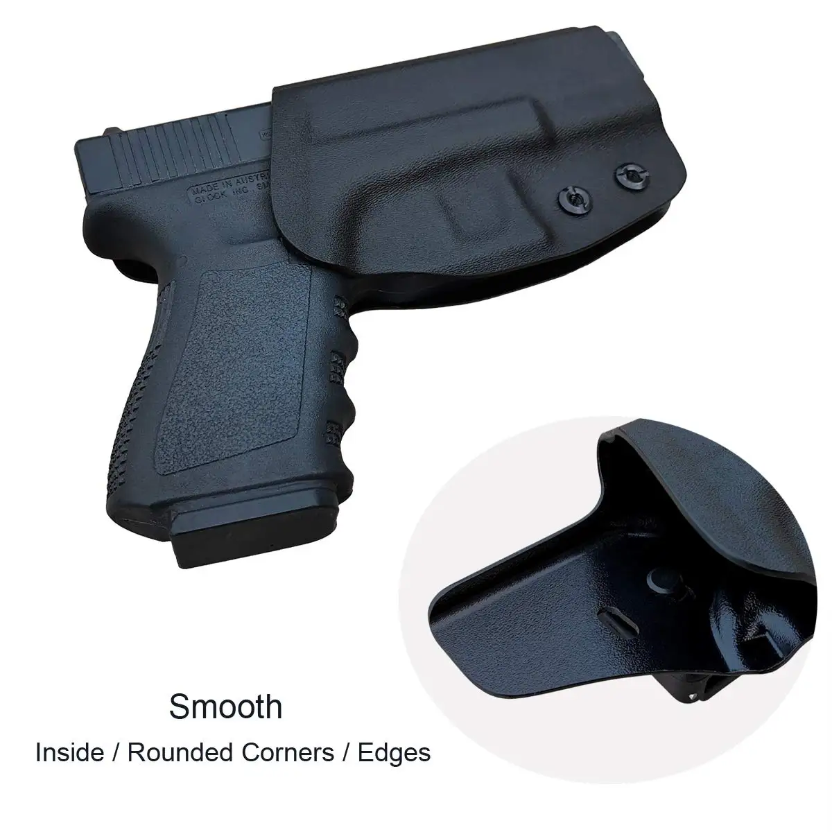 В KYDEX кобуре OWB ручной работы выполнена из прочной 0,08-дюймовый KYDEX сплав пластиковые пластины. Кобура OWB Glock очень тонкая и светильник, менее 100 г. Он водонепроницаемый, устойчивый к поту, обладает высокой прочностью, высокой прочностью, ударопрочностью, износостойкостью и антивозрастными свойствами. Его можно использовать в различных условиях. Таким образом, вы всегда можете положиться на него, чтобы сохранить свою жизнь.