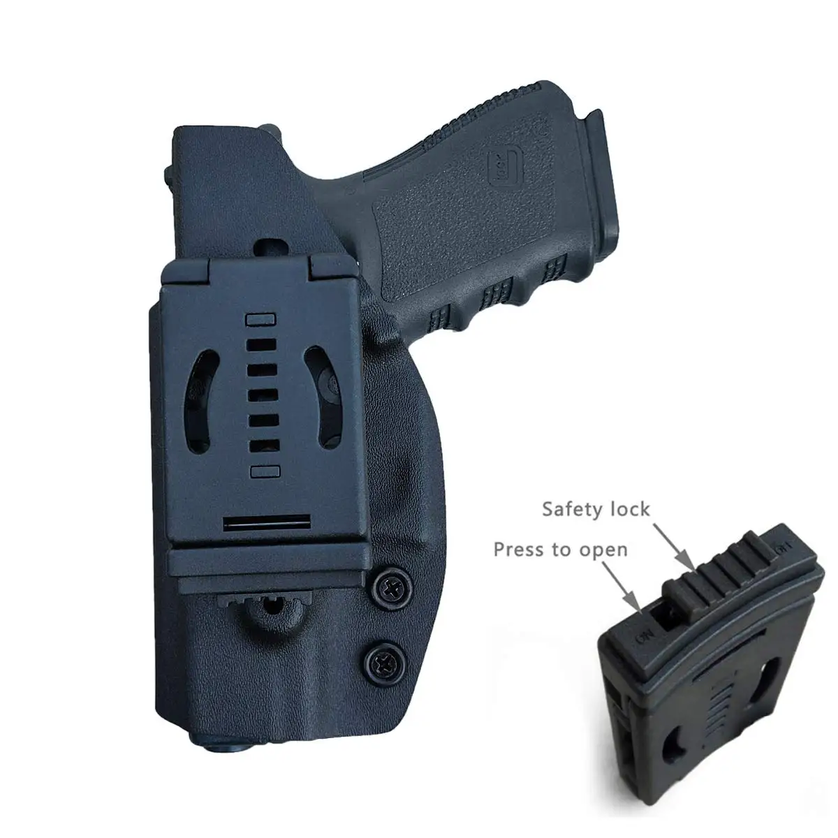 US .08 "KYDEX-легкий-прочный: кобура Glock 19 изготовлена вручную из прочного пластикового листа из сплава KYDEX. Он очень тонкий и светильник, менее 100 г. Он не только водонепроницаемый и защищенный от пота, но также обладает высокой прочностью, высокой прочностью, ударопрочностью, износостойкостью и устойчивостью к старению. Его можно использовать в различных условиях. Таким образом, вы всегда можете положиться на него, чтобы сохранить свою жизнь.