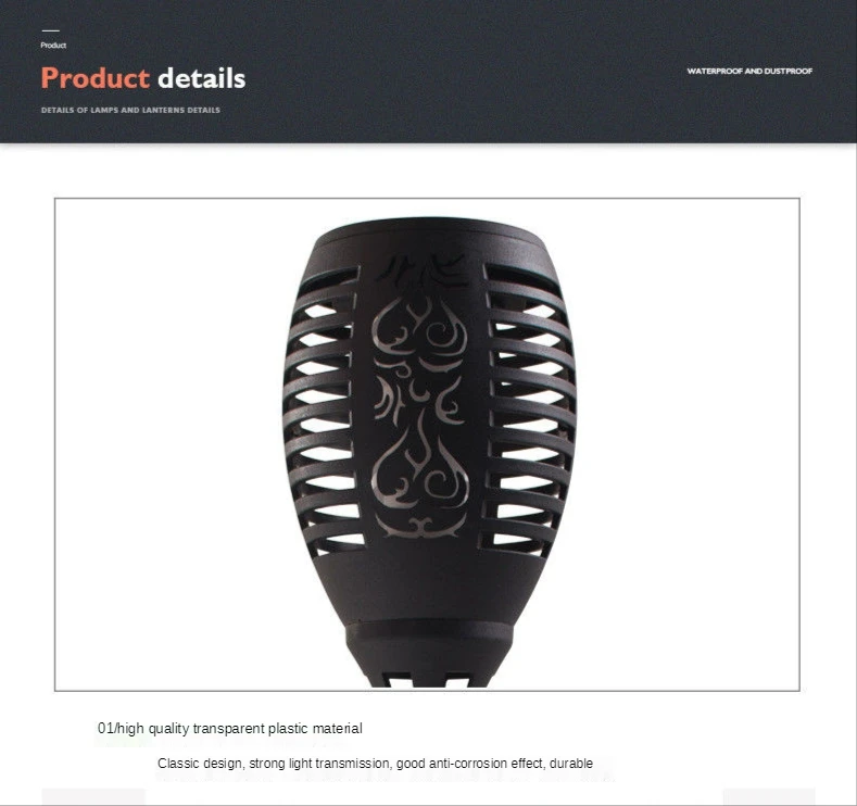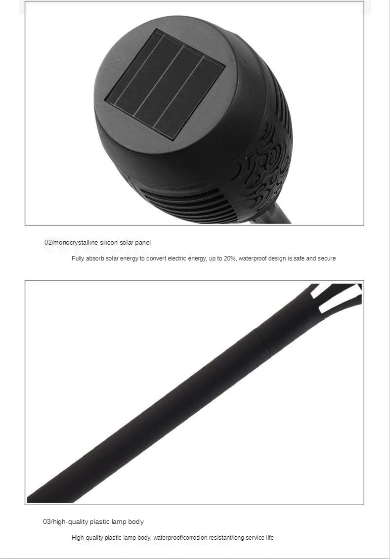 Функция: Открытый-темное, чтобы светильник пламени «биение»-автоматически закрытИзлучающий светильник цвета: желтый/красныйПанель солнечных батарей: 5,5 V / 1 Вт ламинатРежим подсветки: кнопочный переключатель/фотоСветильник шт/набор времени: непрерывного излучения от 10 до 12 часовУровень водонепроницаемости: IP65