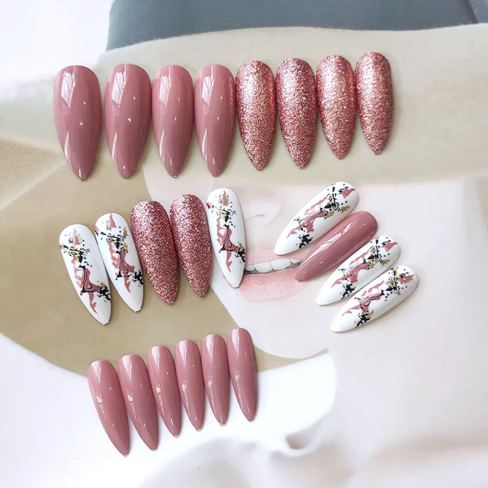 24 шт. искусственные с блестками розовые граффити съемные длинные миндалевидные накладные ногти носимые накладные ногти полное покрытие ногти Советы пресс клей