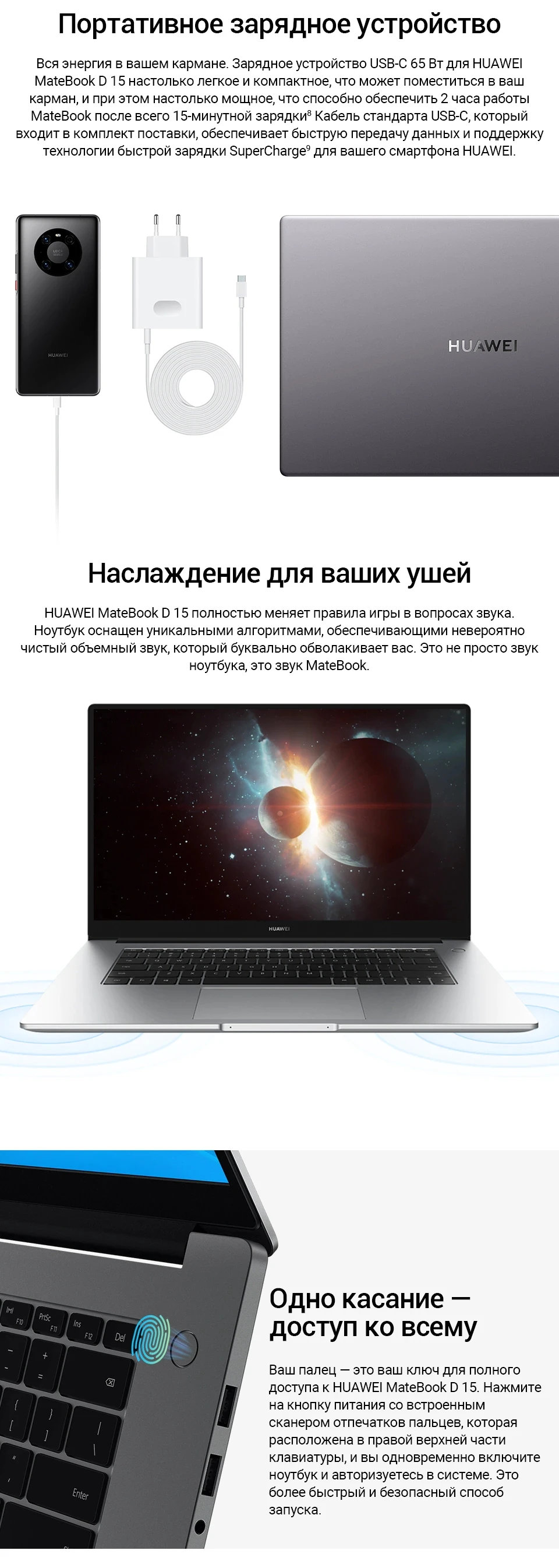Ноутбук HUAWEI MateBook D 15; Адаптер питания HUAWEI USB-C переменного тока; Кабель USB-C; Краткое руководство пользователя