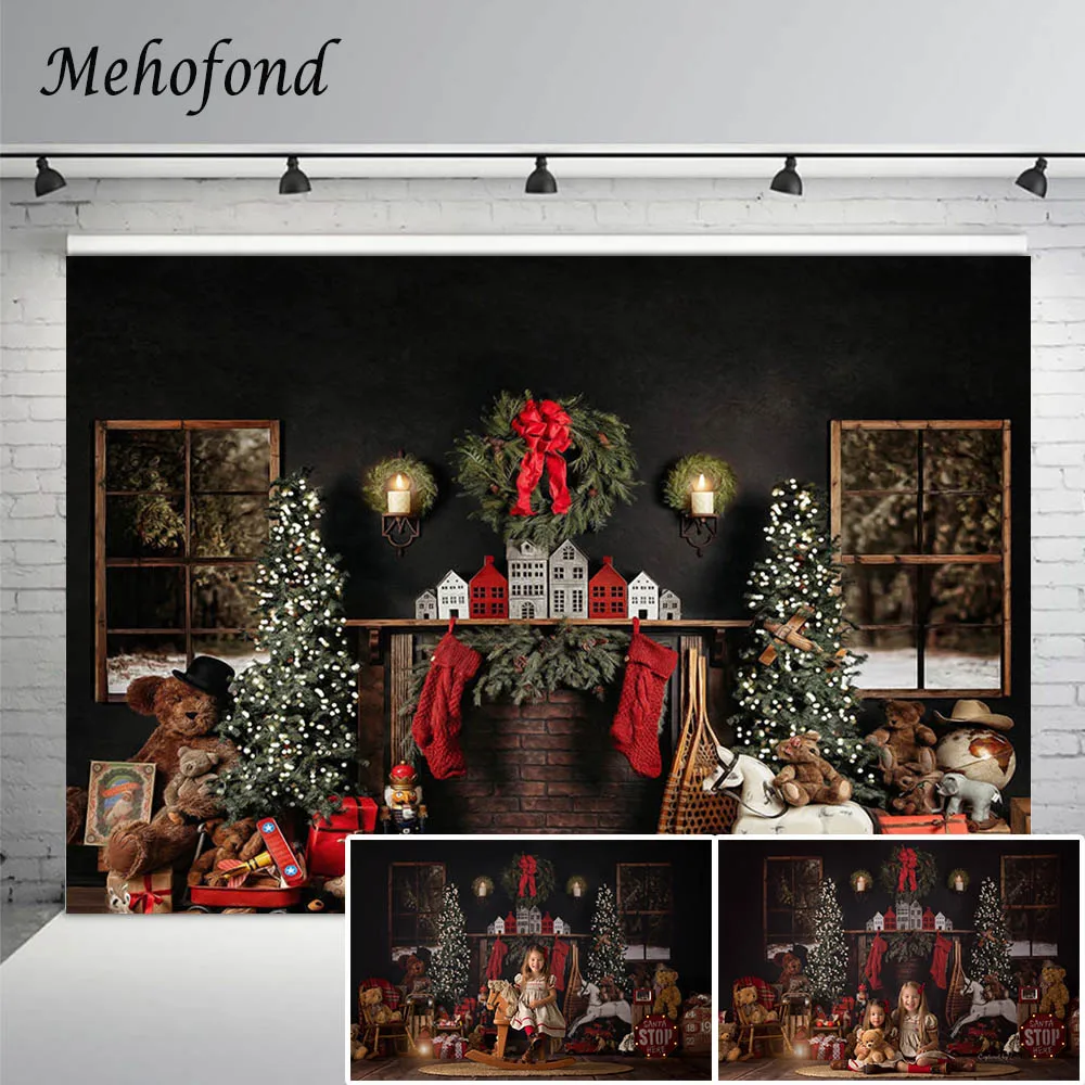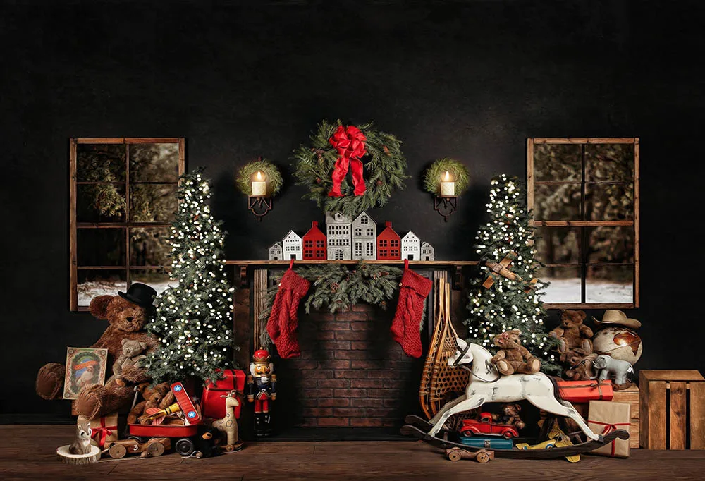Рождественский фон для фотографии Дерево камин кирпичная стена окна игрушки медведь венок ребенок портрет фото фон реквизит