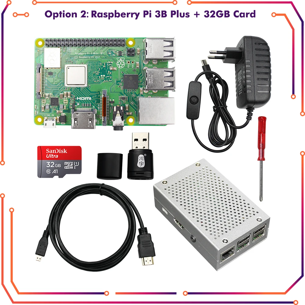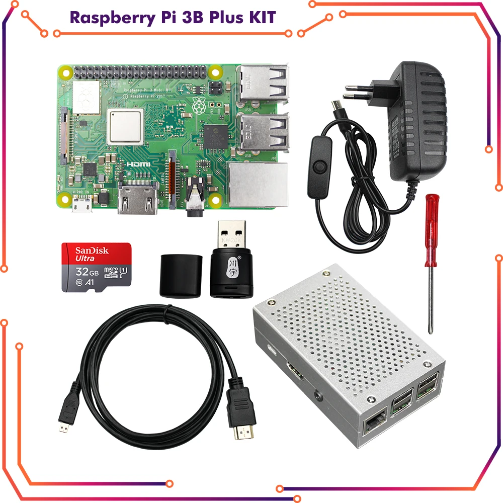 1 шт. Raspberry Pi 3B Plus1 шт. х Алюминиевый чехол1 шт. x Мощность 5 в 3 А с выключателем ВКЛ./ВЫКЛ.1 шт. кабель HDMI1 шт. x 32 Гб sd-карта1 шт. кард-ридер