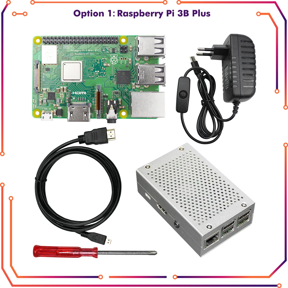 1 шт. Raspberry Pi 3B Plus1 шт. х Алюминиевый чехол1 шт. x Мощность 5 в 3 А с выключателем ВКЛ./ВЫКЛ.1 шт. кабель HDMI