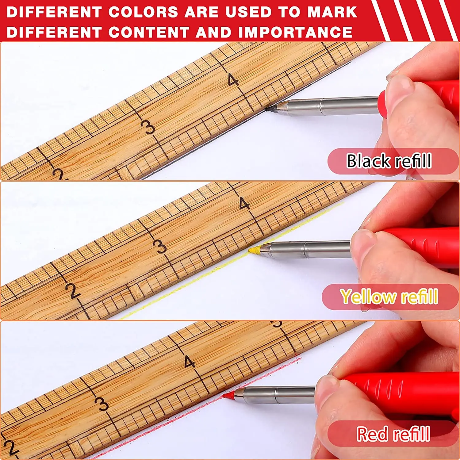 Цвет: B: синий + красный + черный + оранжевыйМатериал: АБС + металлПосылка:3 * деревообрабатывающие карандаши (1 orange/1 синий + 1 красный-с пополнением в комплекте)3 коробки * заправки (18 черных)