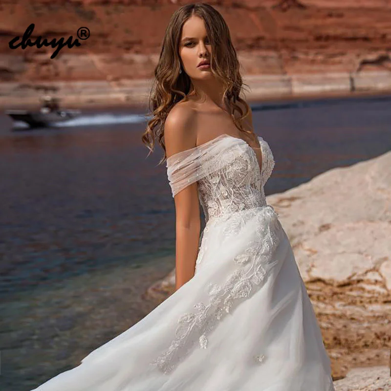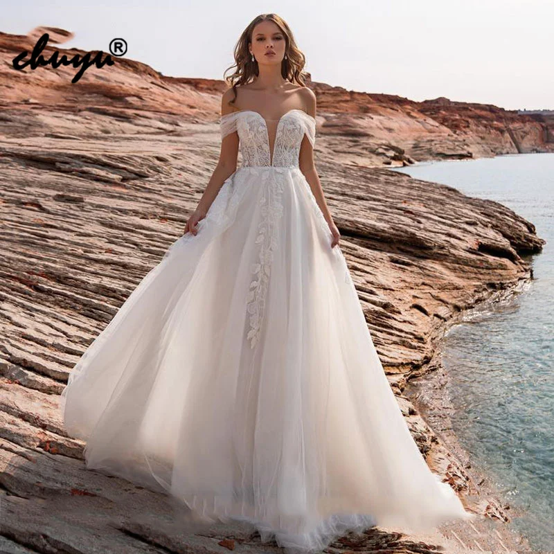 Очаровательные пляжные кружевные свадебные платья ChuYu в стиле бохо с открытыми плечами, открытой спиной, длинным А-силуэтом и уникальным дизайном