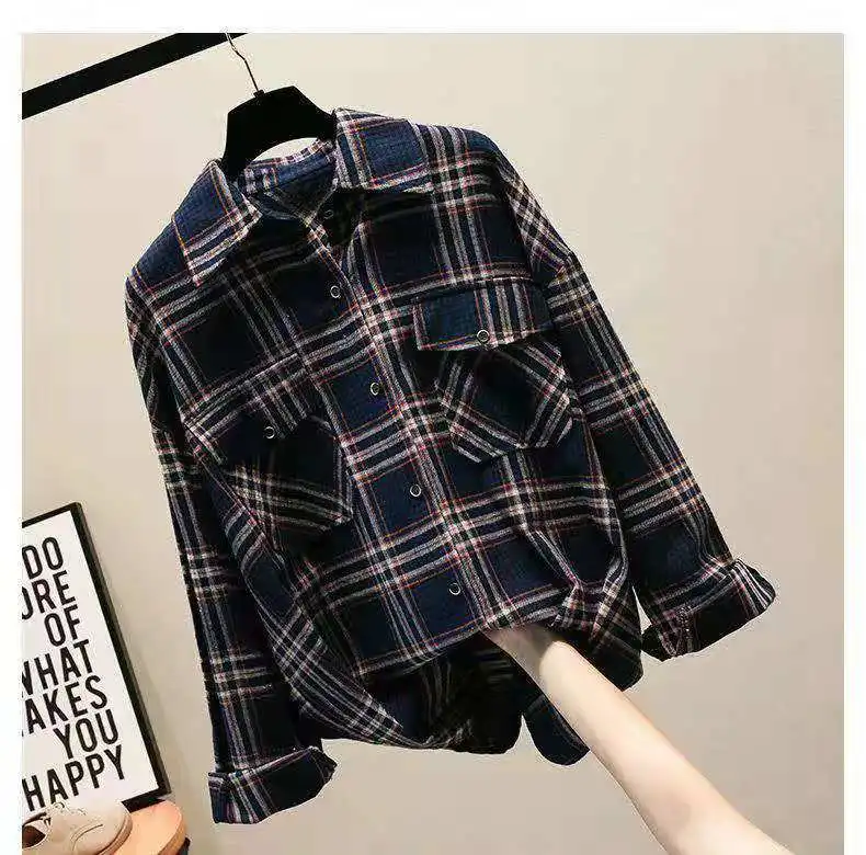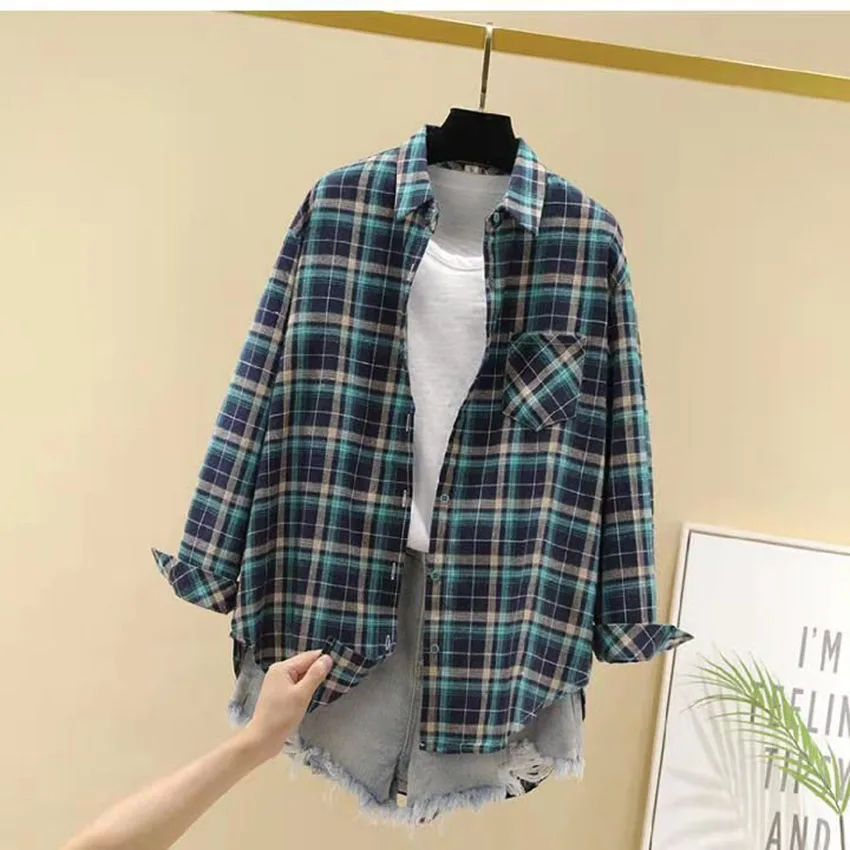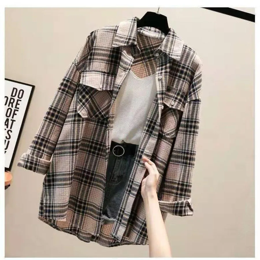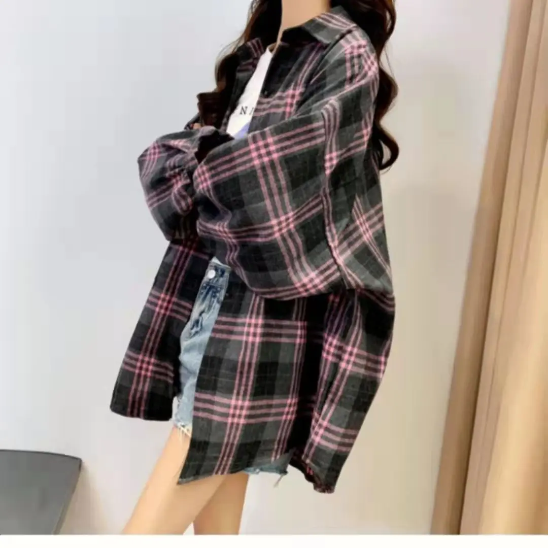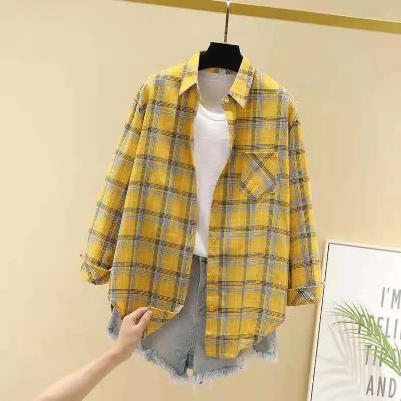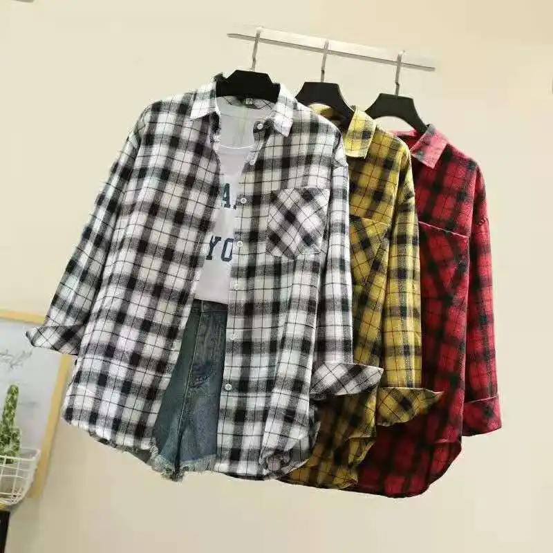 Новое поступление, женская модная свободная клетчатая блузка, Корейская Повседневная льняная рубашка для девушек, хлопковое пальто в клетку с длинным рукавом для осени и весны