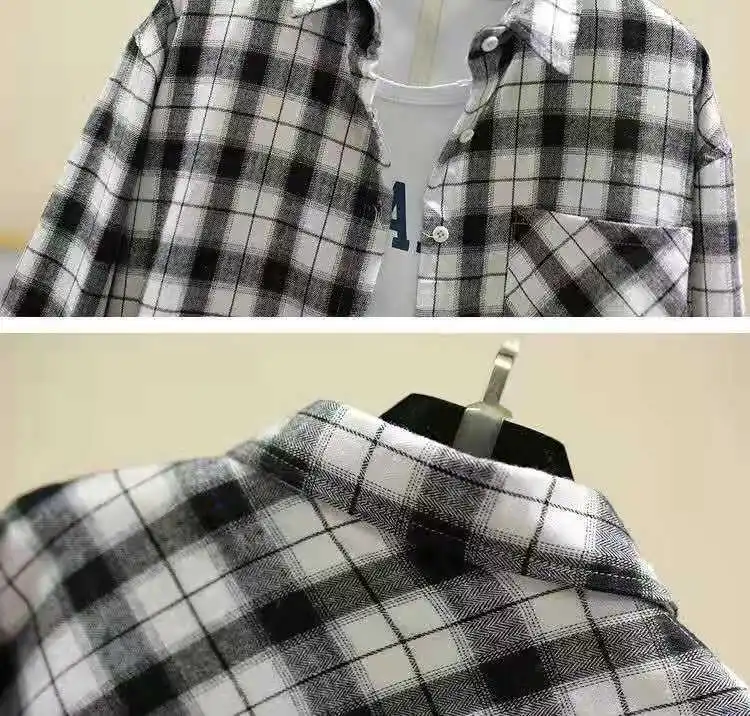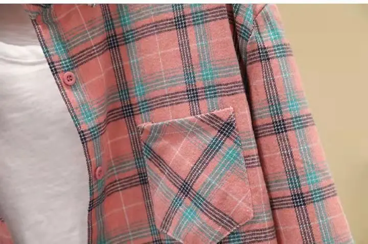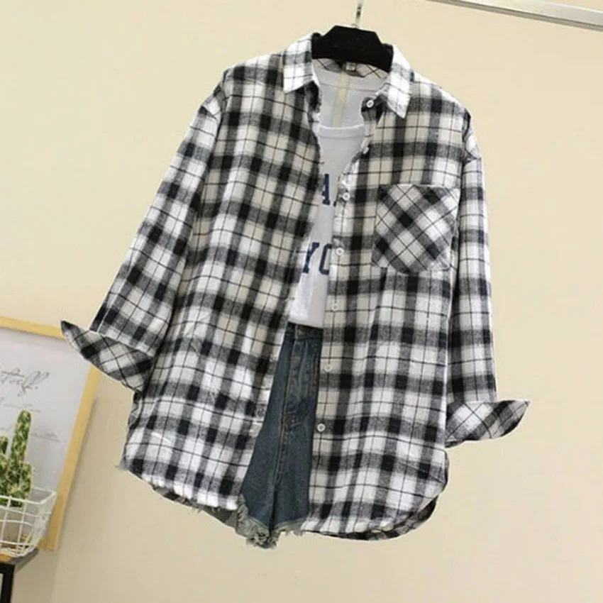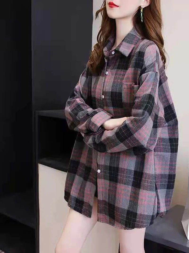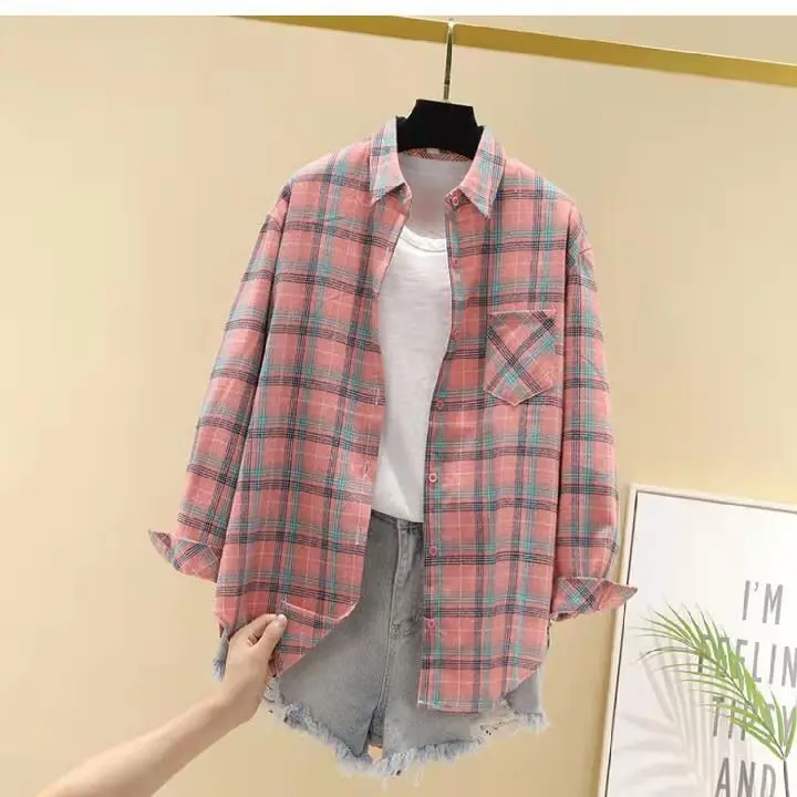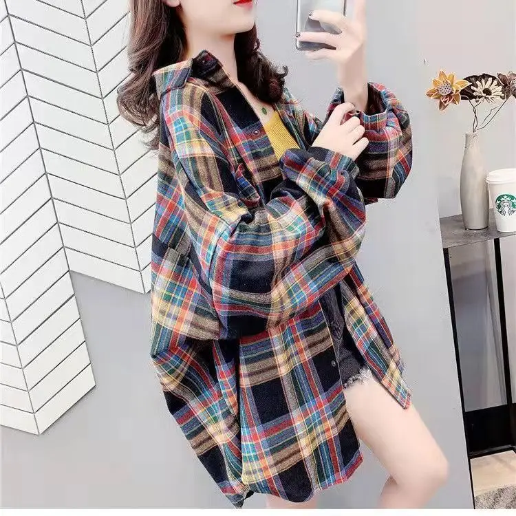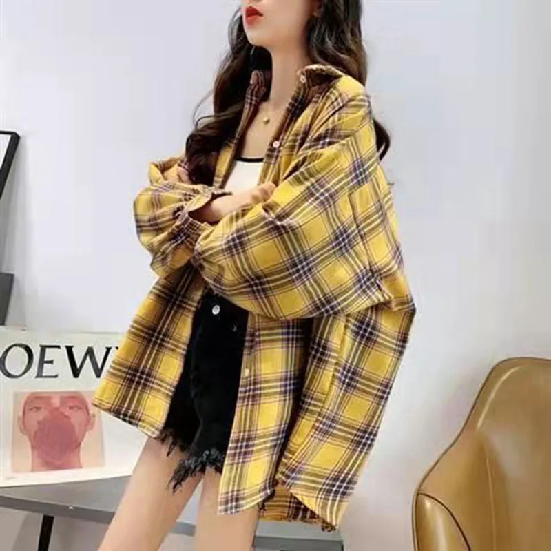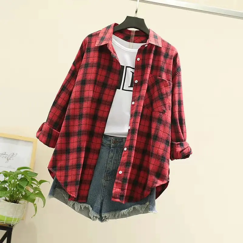 Новое поступление, женская модная свободная клетчатая блузка, Корейская Повседневная льняная рубашка для девушек, хлопковое пальто в клетку с длинным рукавом для осени и весны