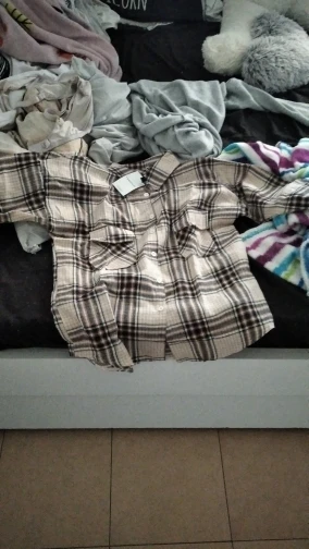 Выглядит почти как в описании. У меня вообще размер м ну или л, эта рубашка застегнулась в притык. И у неё ужасно большие плечи, висят чуть ли не до логтя. Так вроде пойдёт, просто накинуть дома. Если бы не плечи, мне бы даже очень нравилась. Шла почти три недели.