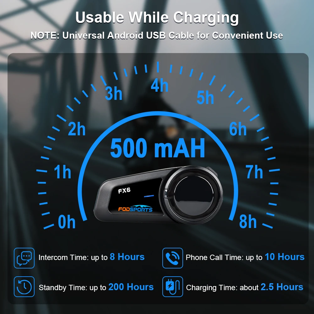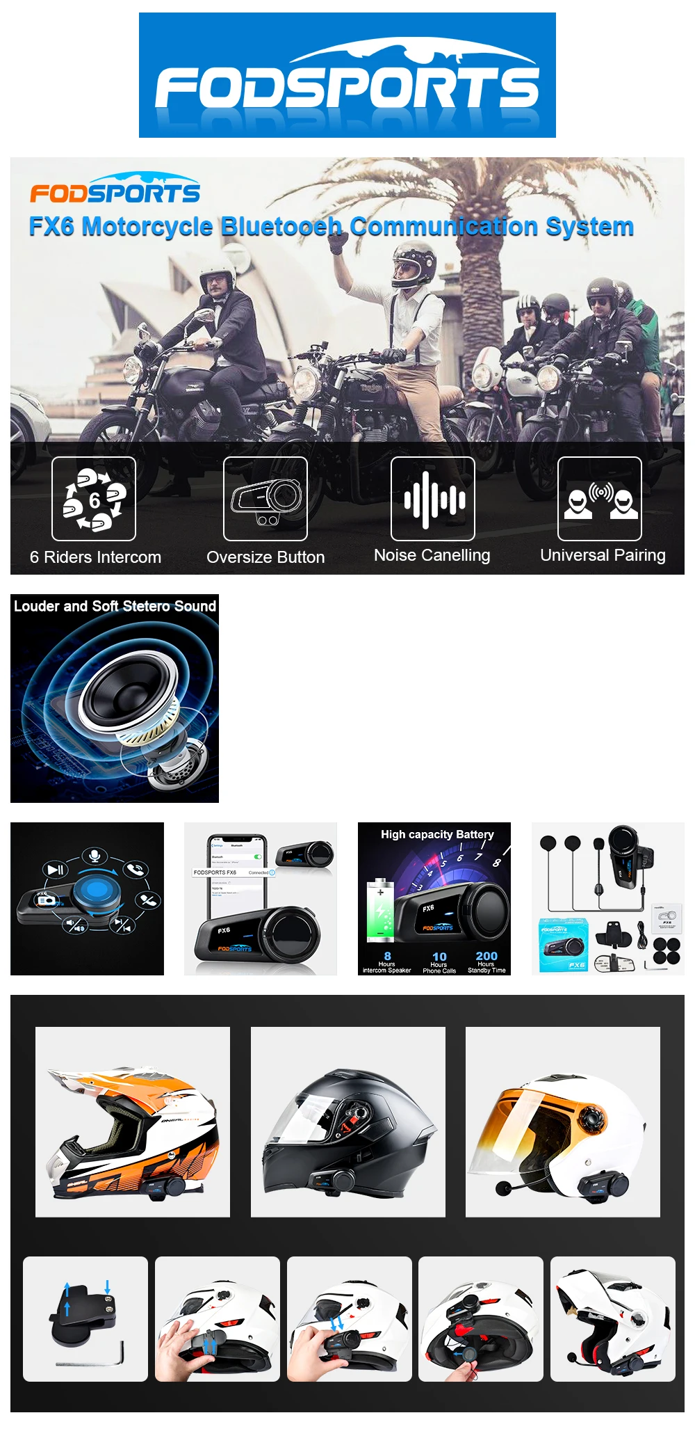 Описание:1. Высокая точность передачи bluetooth музыки и голосовых вызовов2. Версия Bluetooth: чип CSR3,500 м Интерком, поддержка 6 человек для подключения и разговора одновременноАккумулятор емкостью 4,500 мАч, более длительный срок службы батареи.5. Подсказка питания: Полная мощность, умеренная мощность, низкая мощность6. Два вида микрофона подходят для всех шлемов, таких как открытое лицо и шлем с полным лицом7. Получите мобильный телефонный звонок автоматически, автоответчик, последний номер повторного набора и голосового набора8. Fm-радио (Частотный диапазон: 76-108 МГц)9. Микрофон с защитой от шума, функция цифрового шумоподавления CVC10. Наслаждайтесь музыкой через bluetooth, Включите мобильный телефон/MP3/GPS. (A2DP стерео музыка)11. Пара с 3 устройствами Bluetooth12. Универсальное сопряжение, можно подключить bluetooth-гарнитуру13. Два вида способов установки задних зажимов (установка зажимов/3 м клеевая палочка и липучка)Характеристики продукта:【 Максимальный диаметр 500 м FX6 оснащен чипом Bluetooth CSR, он обладает высокой совместимостью и стабильностью. Если нет препятствий, таких как здания в прямой линии, мотоциклетный шлем Интерком максимальное расстояние связи группы составляет около 500 метров, максимальное эффективное расстояние связи между двумя мотоциклами составляет около 500 метров, оба могут говорить с четким качеством звука.【 Поддержка 6 всадников групповое соединение 】полный дуплекс вызов для группы мотоциклов гарнитуры системы, поддержка нескольких людей одновременного вызова. Благодаря гарнитурам FX6 вы можете обеспечить безопасность и удобство рук, слушать музыку, получать gps-маршруты и получать голосовые команды по беспроводному каналу через Bluetooth, позволяя вам наслаждаться гонок.【 Шумоподавление и водонепроницаемость 】поскольку микрофон bluetooth-гарнитуры мотоцикла имеет чип CSR, Окружающий шум, такой как шум ветра и шум двигателя, не раздражает. Качество голоса не влияет даже на высокую скорость. Кроме того, он является водонепроницаемым и пыленепроницаемым, может использоваться в любых погодных условиях.【 Кристально чистое качество звука и handsfree】этот шлем гарнитура Интерком использует высокое качество звука полный диапазон мембраны мономера. FX6 имеет высокое качество звука, особенно для басов имеет высокую воспроизводимость. FX6 имеет функцию громкой связи, в соответствии с вашими предпочтениями, чтобы установить характеристики продукта【Долгий режим ожидания батареи и два варианта для микрофона 】 мотоциклетный шлем связь с 500 мАч аккумуляторная батарея, в режиме ожидания до одной недели, время работы до 8-10 часов. FX6 bluetooth мотоциклетная гарнитура имеет жесткий микрофон и мягкий микрофон, подходит для всех видов шлемов. Вы можете выбрать жесткий микрофон для шлема с открытым лицом и мягкий микрофон для шлема с полным лицом.