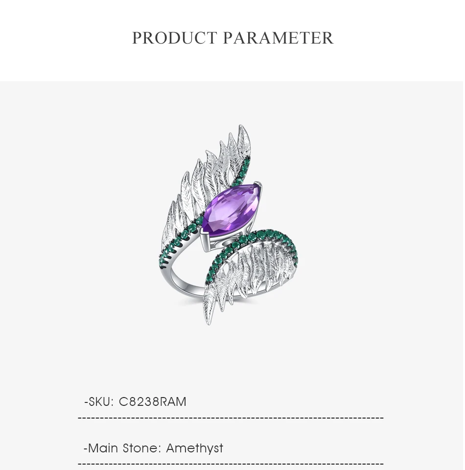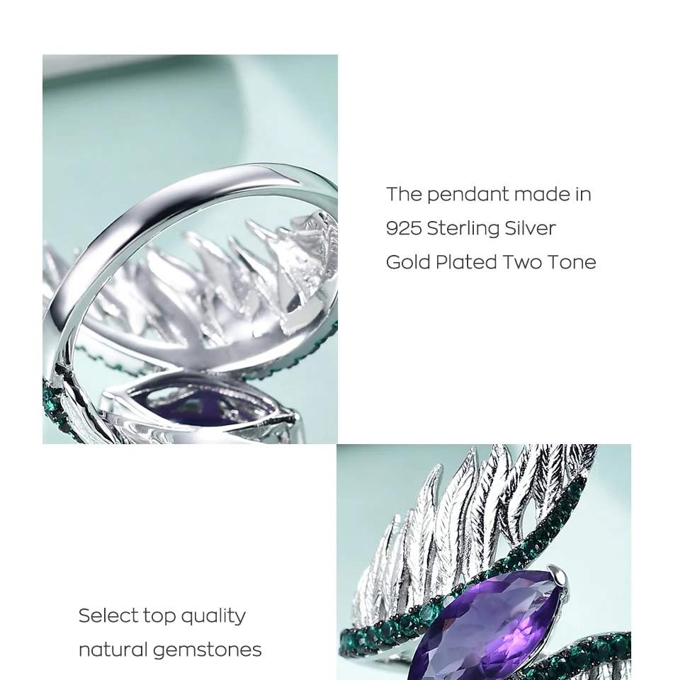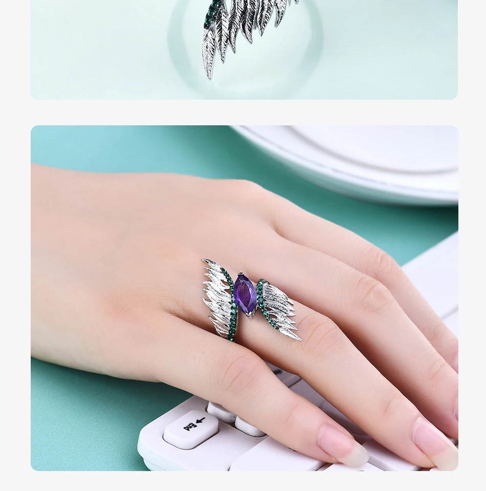Женское кольцо из серебра 925 пробы, с перьями и аметистом