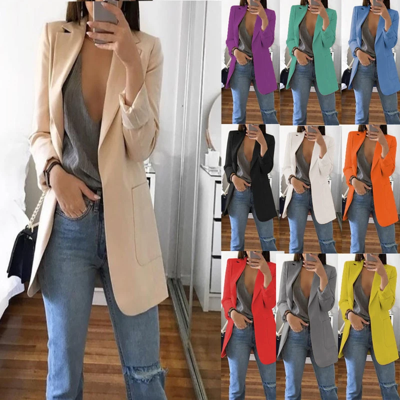 Женский офисный пиджак с отложным воротником, черный однотонный Кардиган с длинным рукавом, осенний пиджак